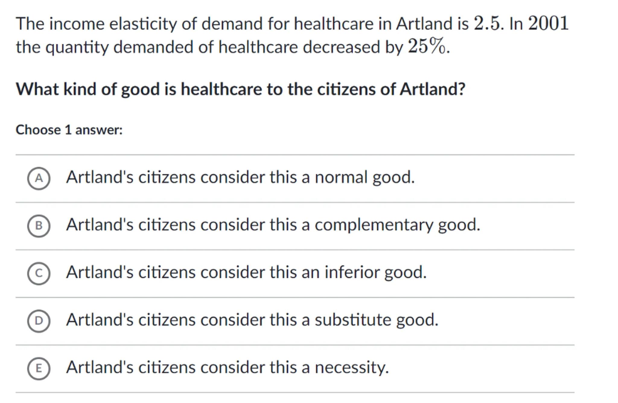 The income elasticity of demand for healthcare in Artland is 2.5. In 2001 the quantity demanded of healthcare decreased by .