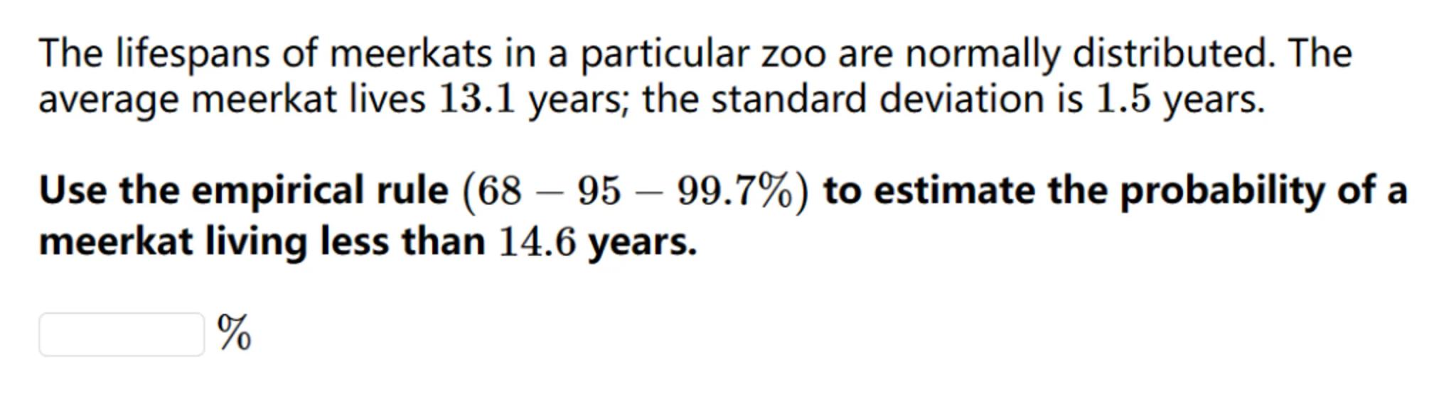 Use the empirical rule to estimate the probability of a meerkat living less than 14.6 years.