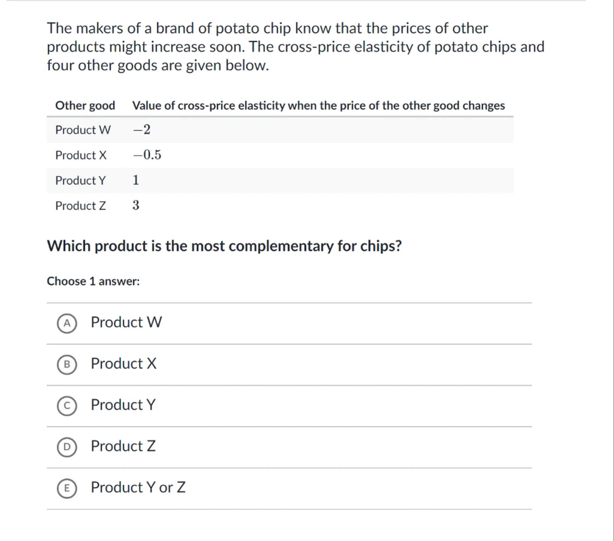 The makers of a brand of potato chip know that the prices of other products might increase soon. The cross-price elasticity of potato chips and four other goods are given below.