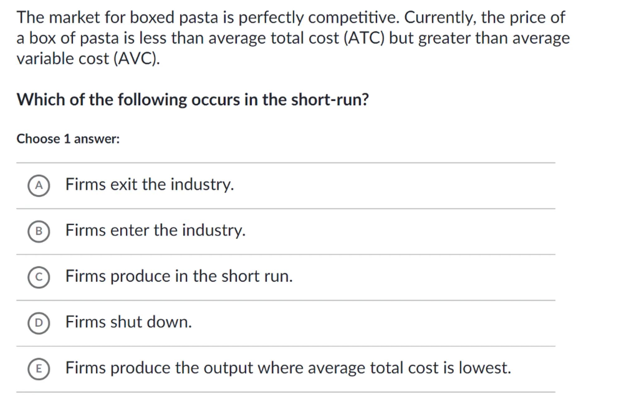 The market for boxed pasta is perfectly competitive. Currently, the price of a box of pasta is less than average total cost (ATC) but greater than average variable cost (AVC).