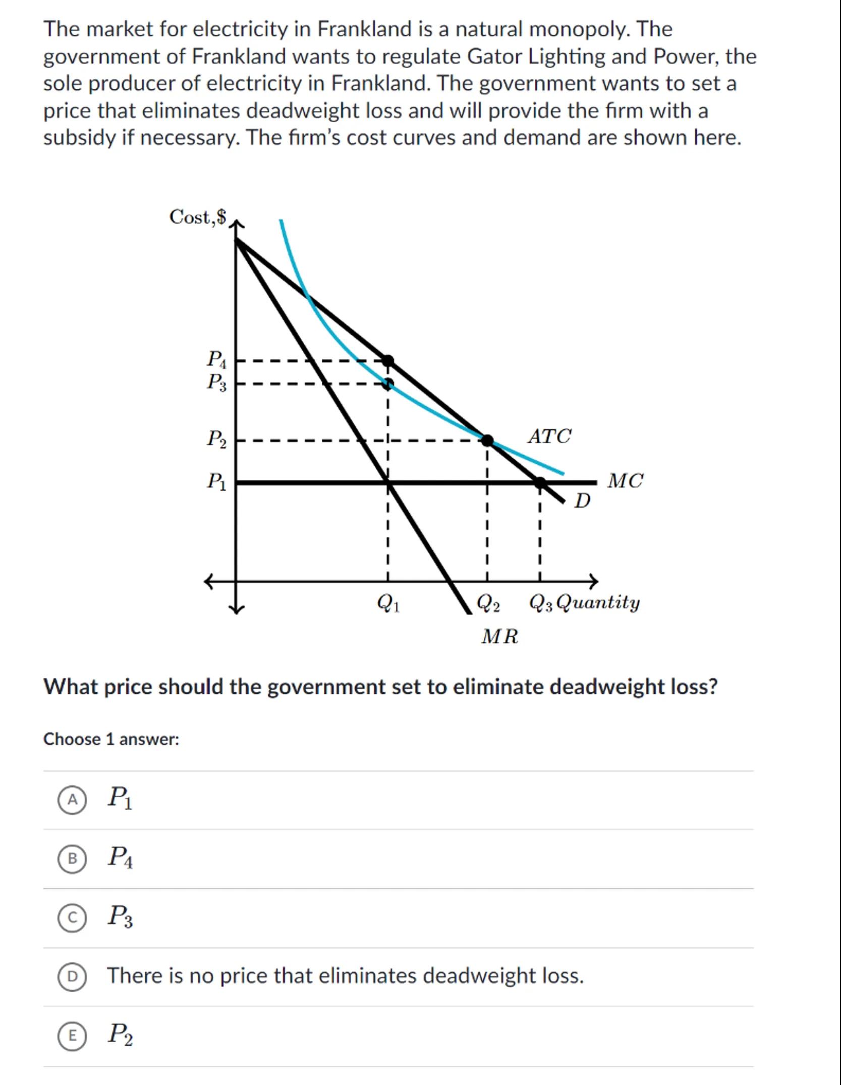 The market for electricity in Frankland is a natural monopoly. The government of Frankland wants to regulate Gator Lighting and Power, the sole producer of electricity in Frankland. The government wants to set a price that eliminates deadweight loss and will provide the firm with a subsidy if necessary. The firm's cost curves and demand are shown here.