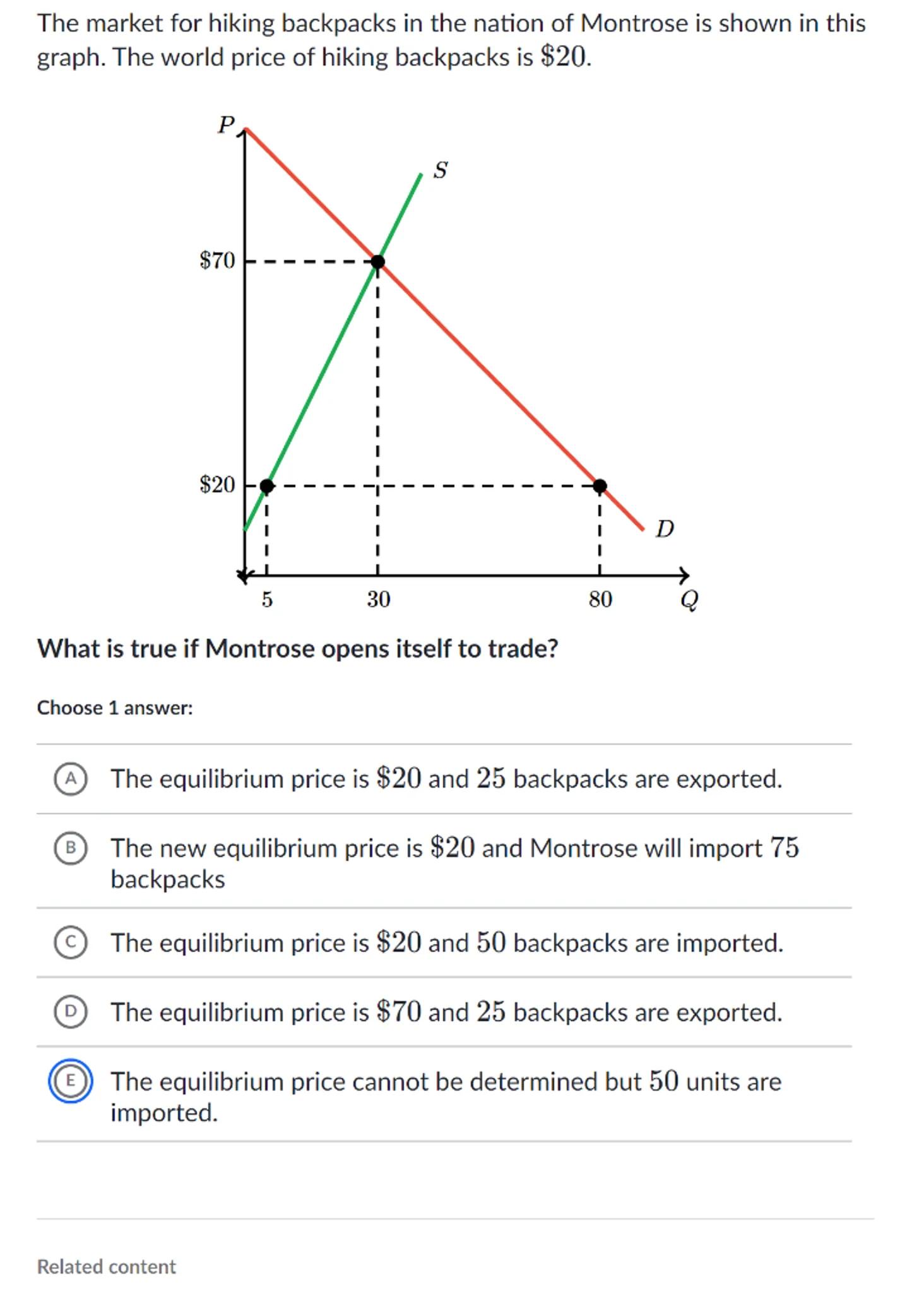 (B) The new equilibrium price is and Montrose will import 75 backpacks