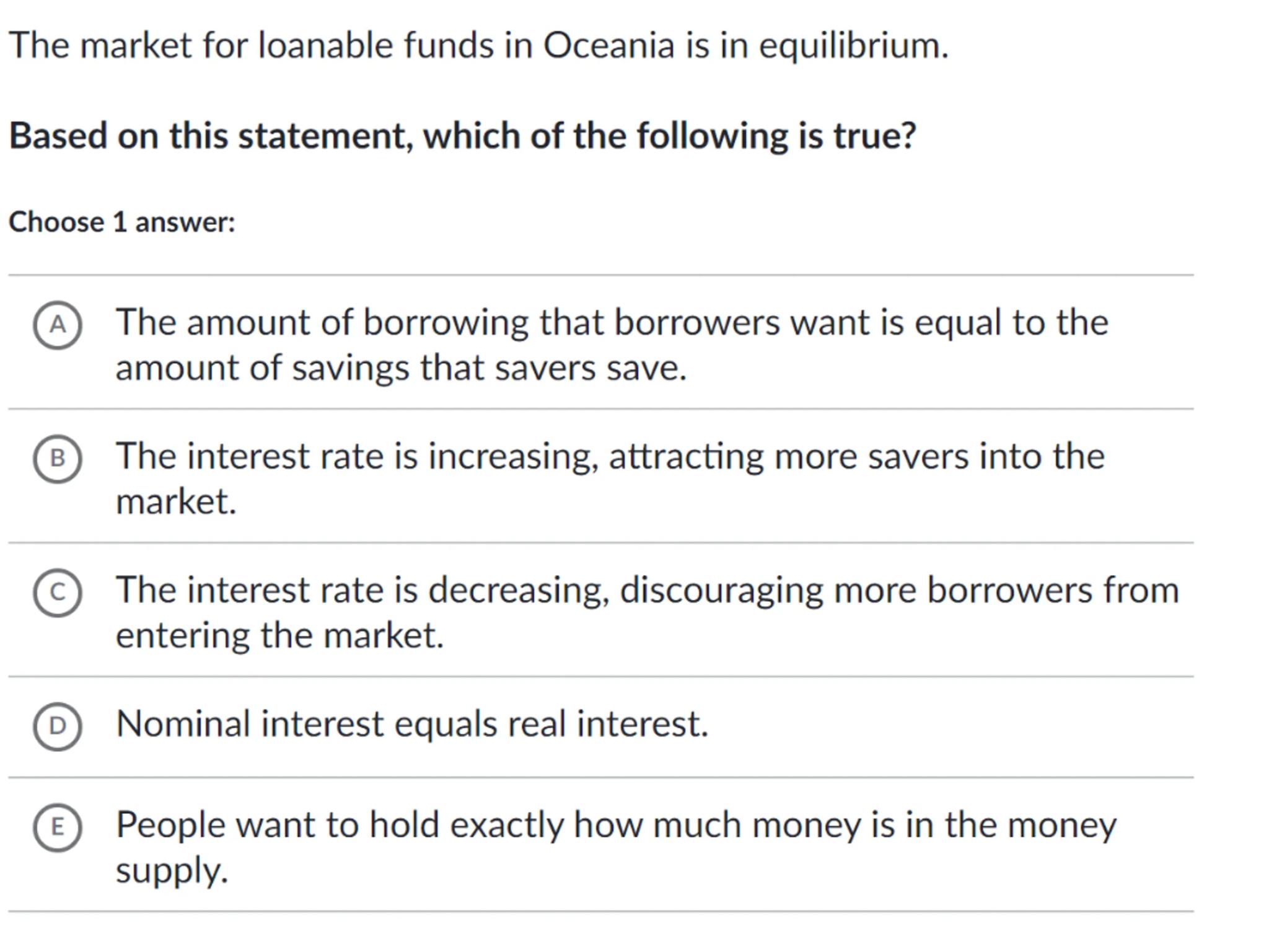 (A) The amount of borrowing that borrowers want is equal to the amount of savings that savers save.