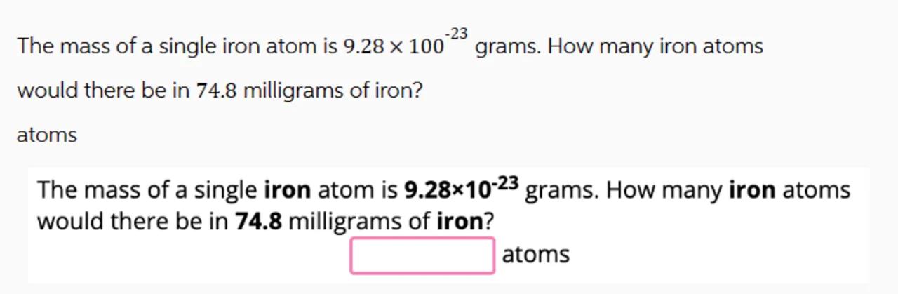 The mass of a single iron atom is grams. How many iron atoms would there be in 74.8 milligrams of iron?