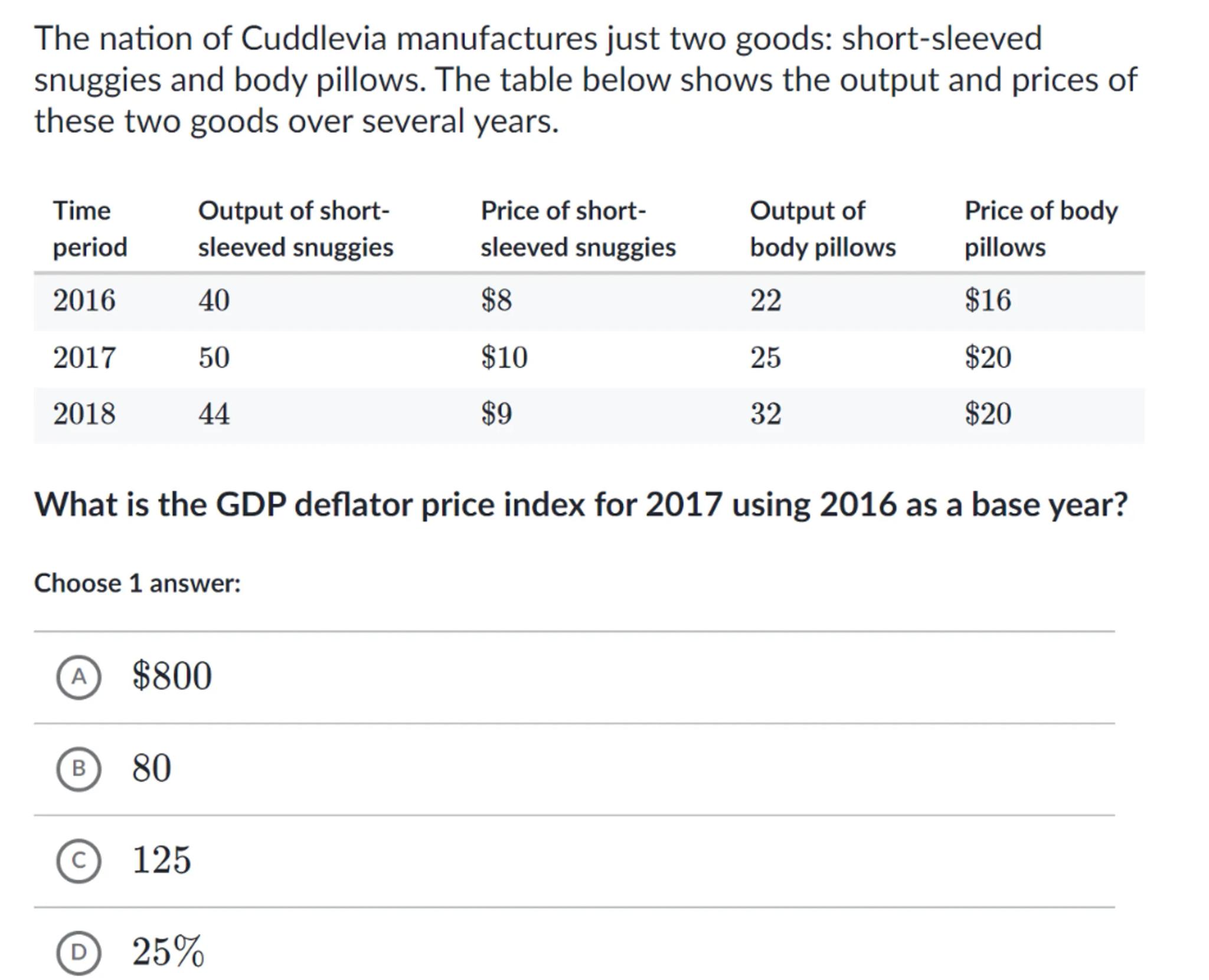 The nation of Cuddlevia manufactures just two goods: short-sleeved snuggies and body pillows. The table below shows the output and prices of these two goods over several years.