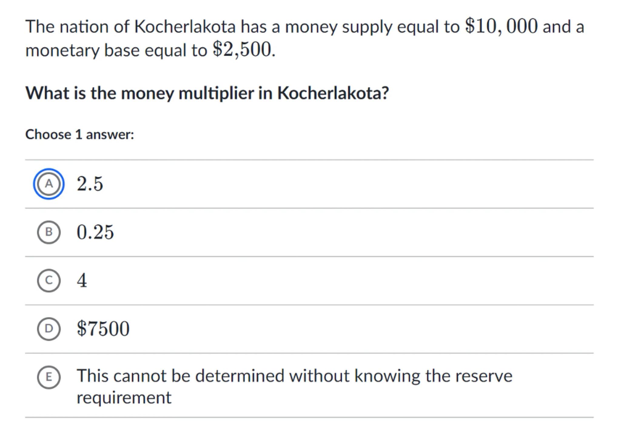 The nation of Kocherlakota has a money supply equal to and a monetary base equal to .