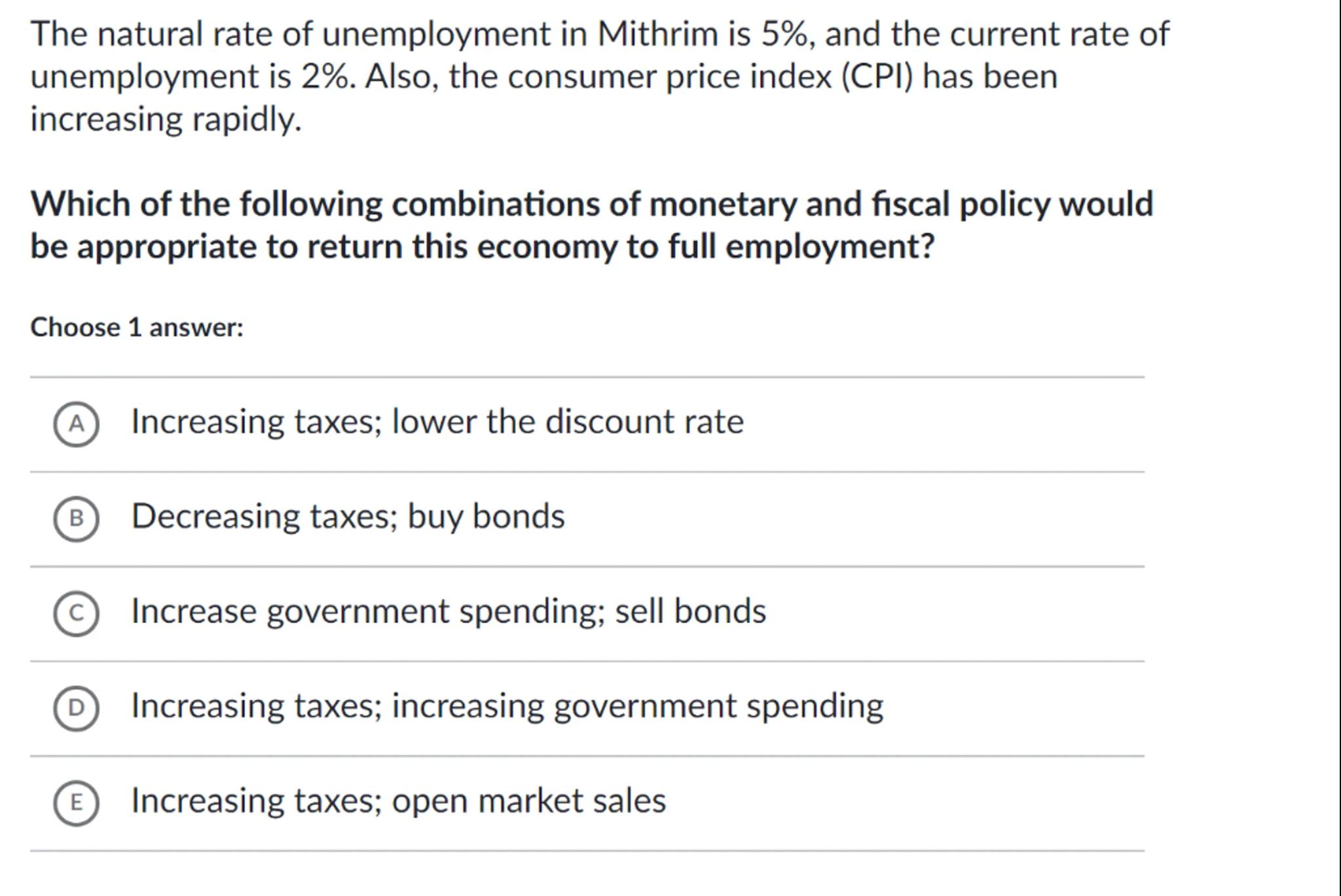 The natural rate of unemployment in Mithrim is , and the current rate of unemployment is . Also, the consumer price index (CPI) has been increasing rapidly.