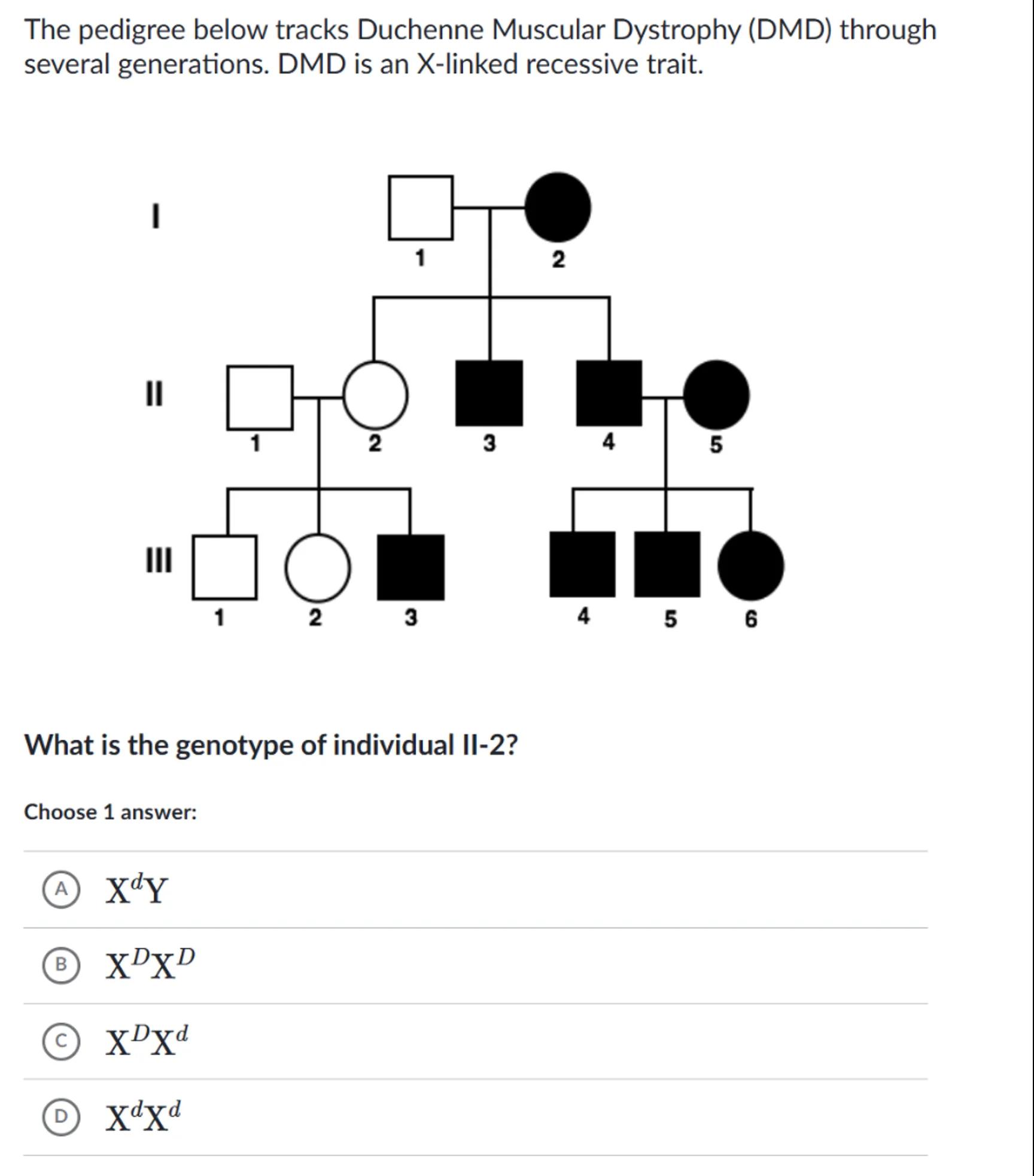 The pedigree below tracks Duchenne Muscular Dystrophy (DMD) through several generations. DMD is an X-linked recessive trait.