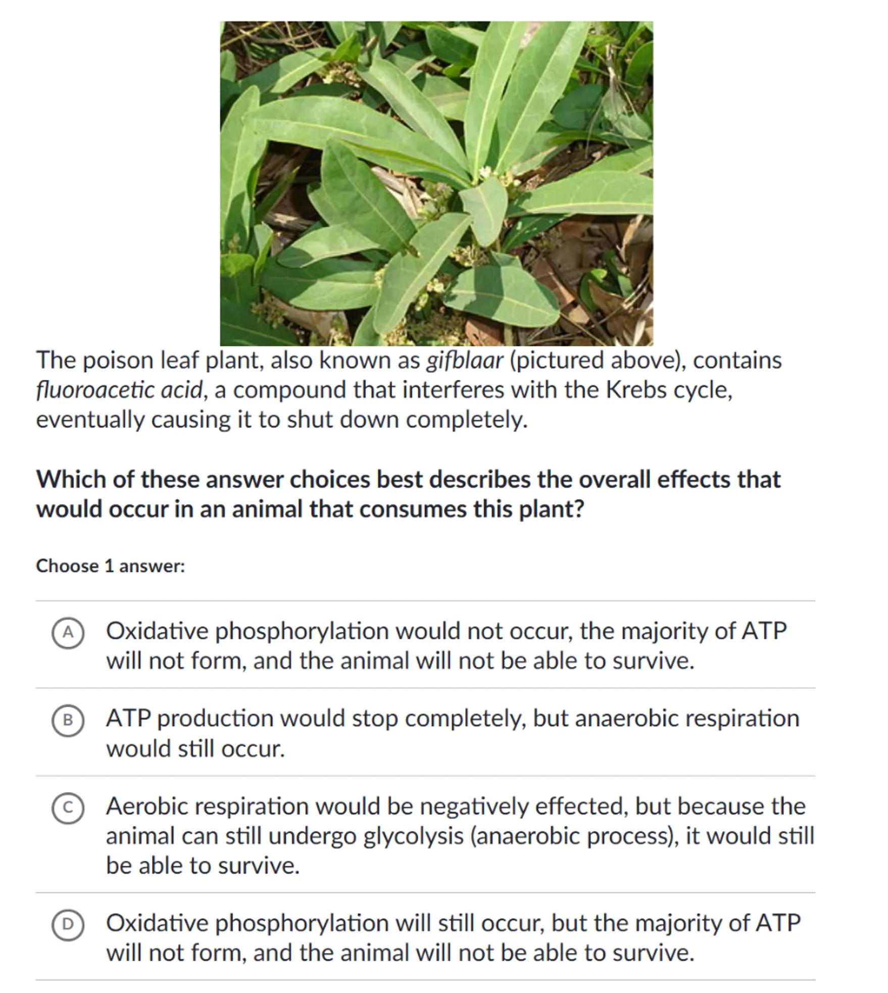 The poison leaf plant, also known as gifblaar (pictured above), contains fluoroacetic acid, a compound that interferes with the Krebs cycle, eventually causing it to shut down completely.