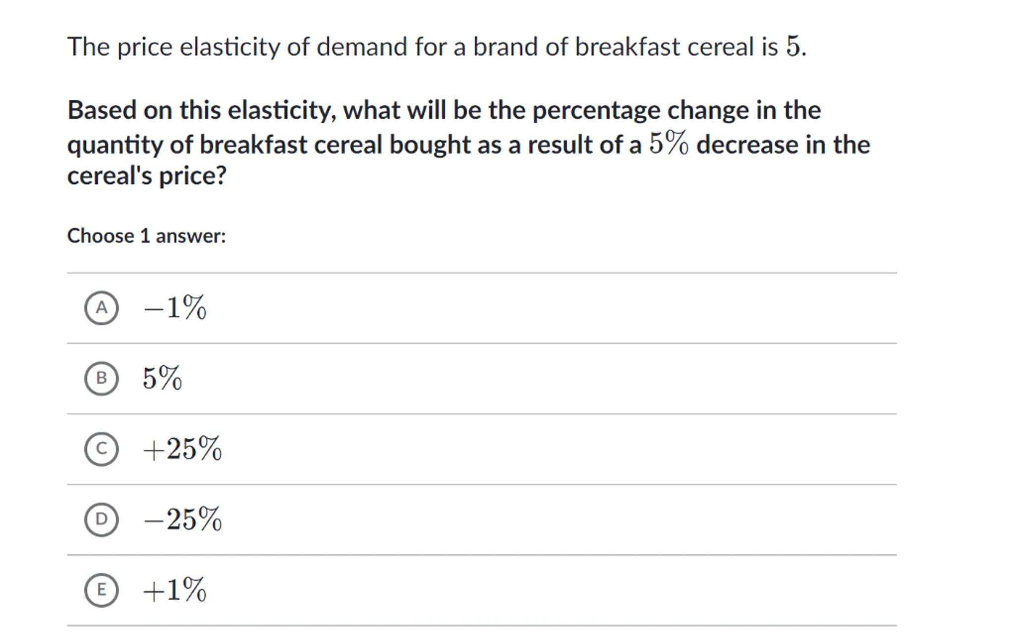 The price elasticity of demand for a brand of breakfast cereal is 5 .