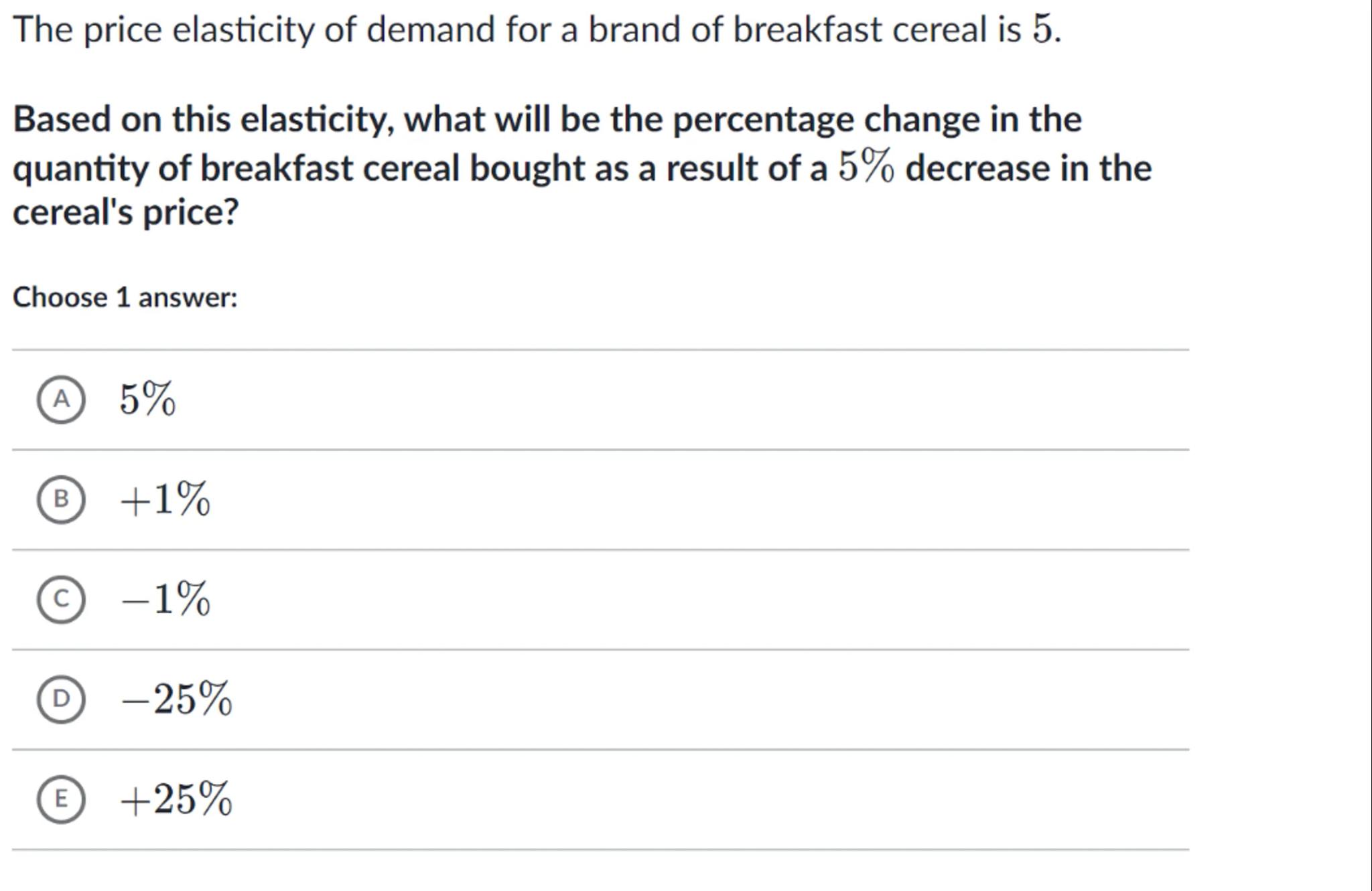 The price elasticity of demand for a brand of breakfast cereal is 5 .