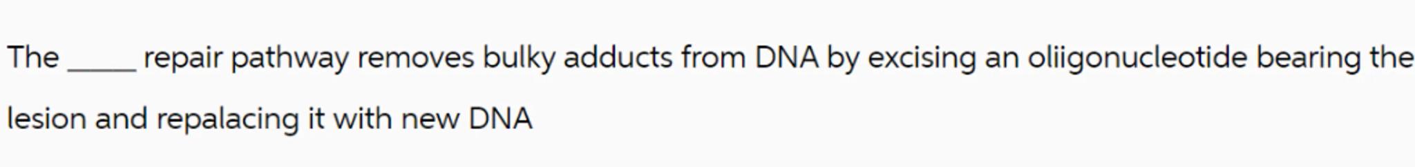 The repair pathway removes bulky adducts from DNA by excising an oliigonucleotide bearing the lesion and repalacing it with new DNA