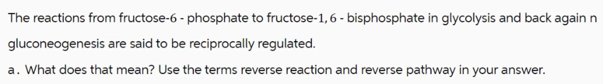 The reactions from fructose-6 - phosphate to fructose-1, 6 - bisphosphate in glycolysis and back again gluconeogenesis are said to be reciprocally regulated.