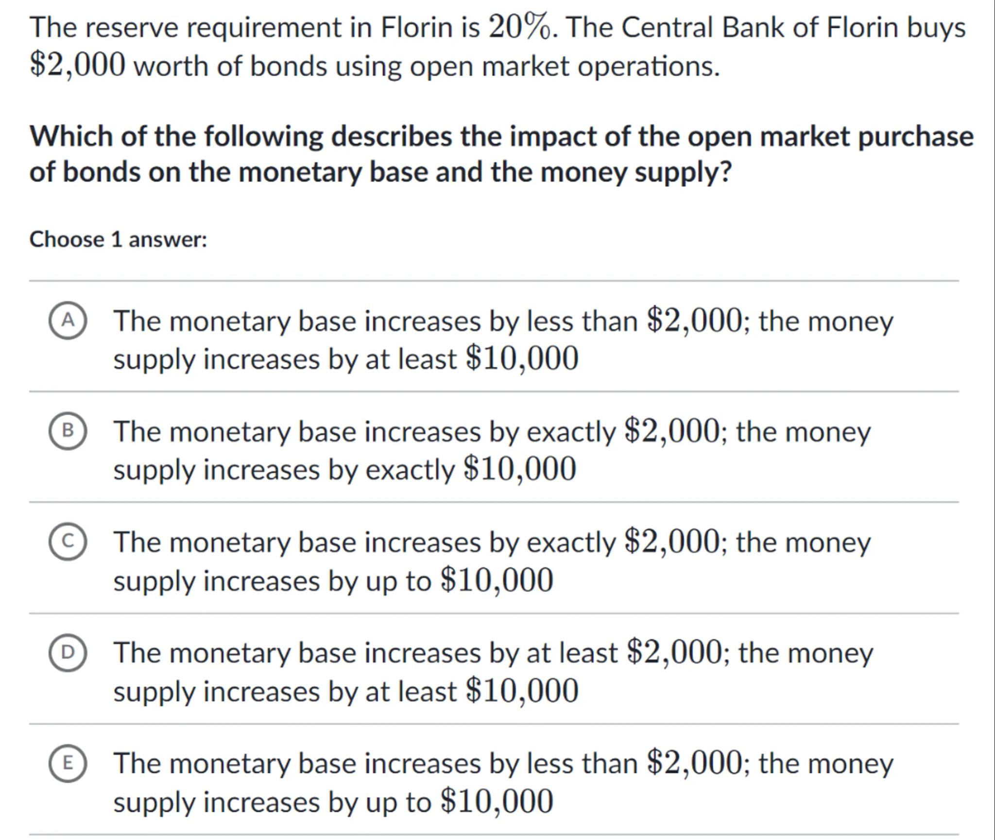 The reserve requirement in Florin is . The Central Bank of Florin buys worth of bonds using open market operations.