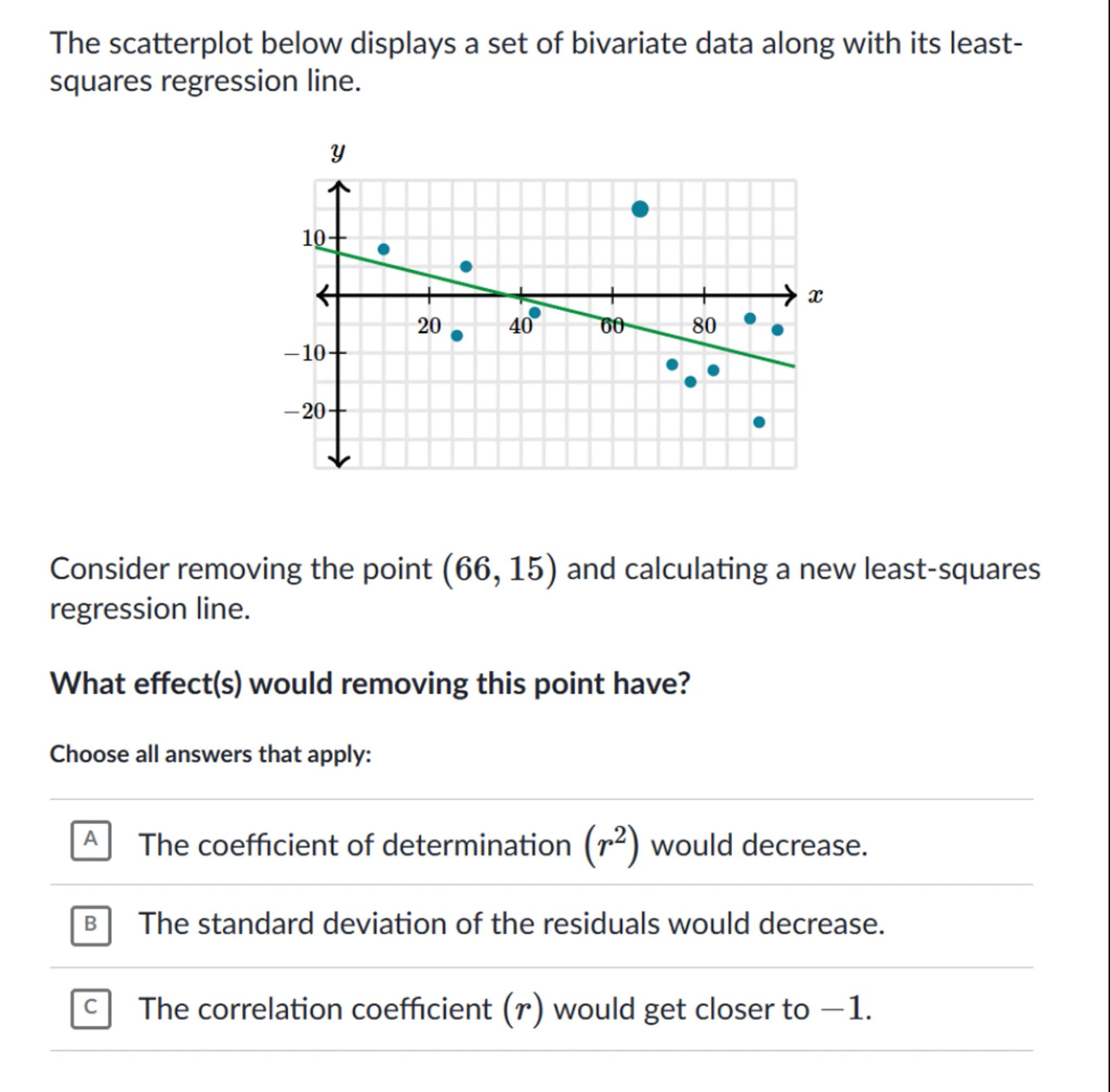 The scatterplot below displays a set of bivariate data along with its leastsquares regression line.