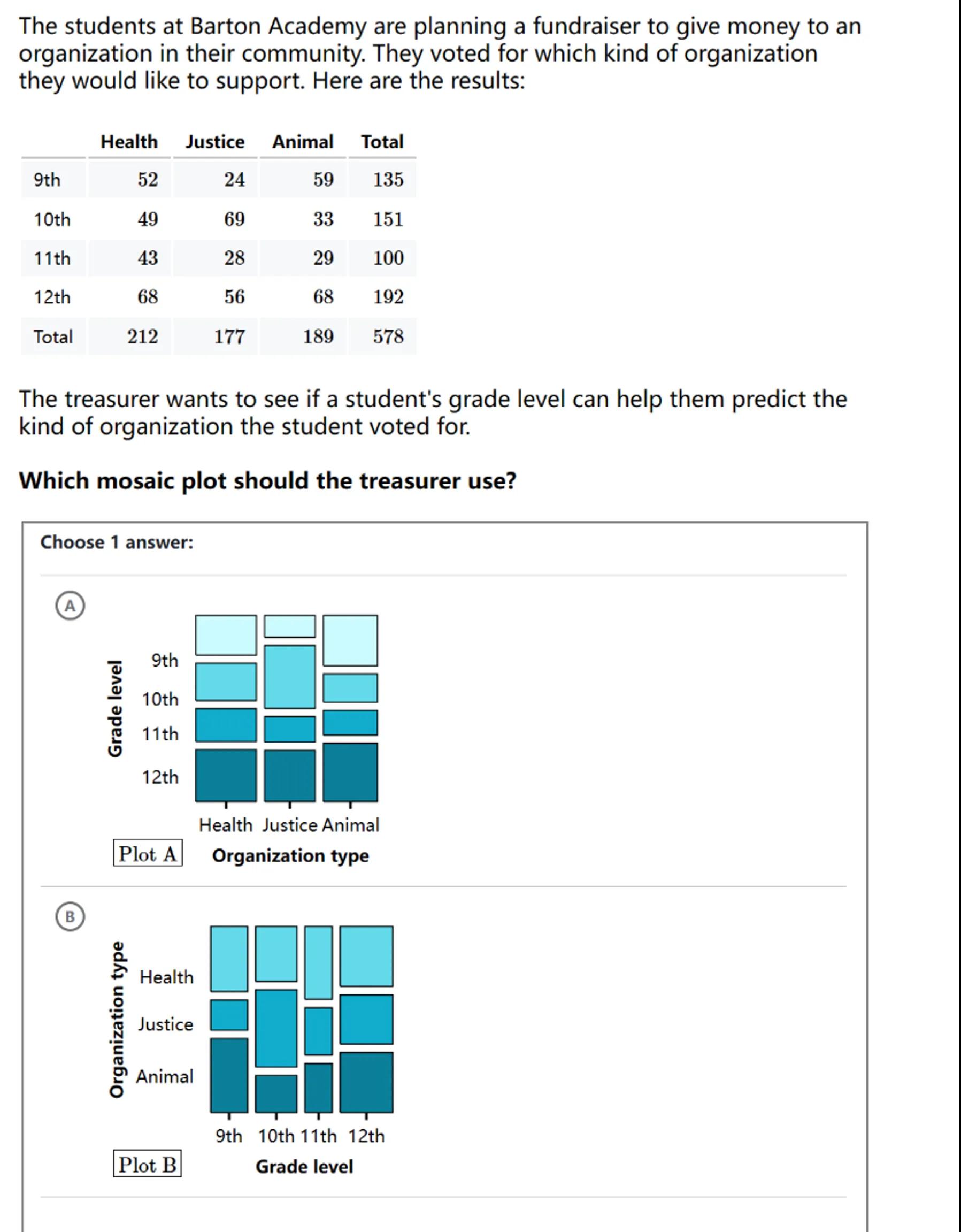 The treasurer wants to see if a student's grade level can help them predict the kind of organization the student voted for.