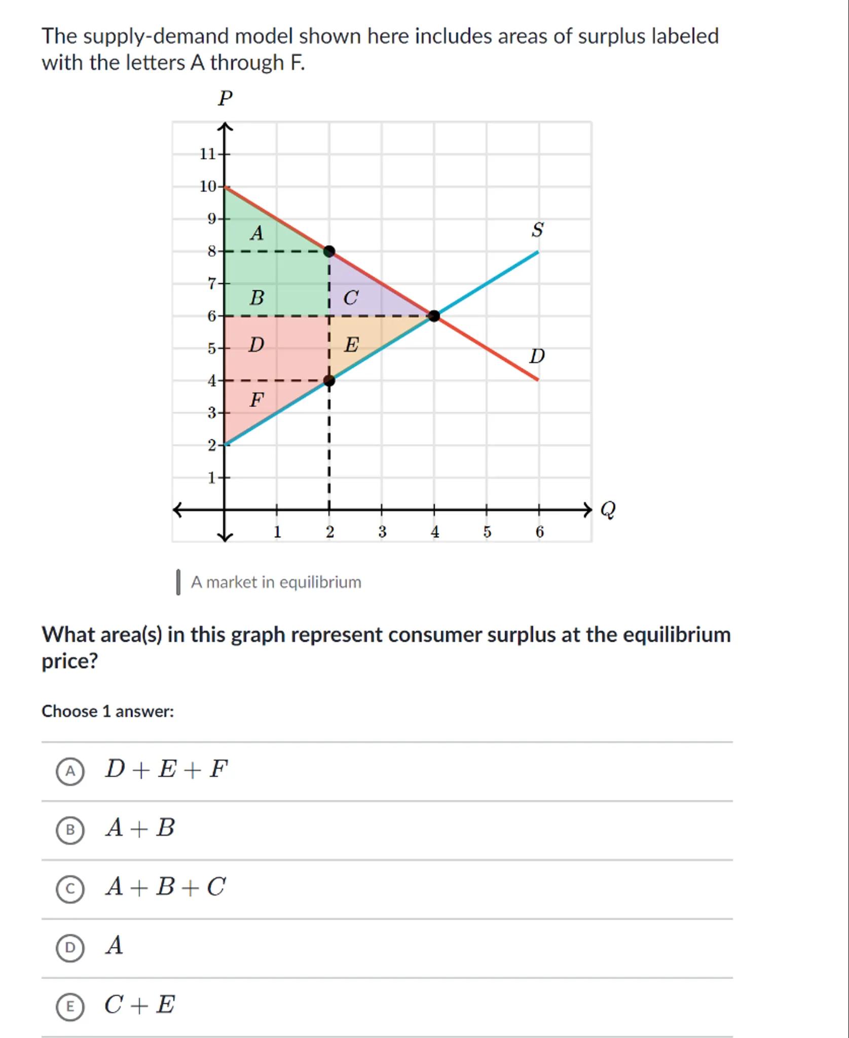 The supply-demand model shown here includes areas of surplus labeled with the letters through .