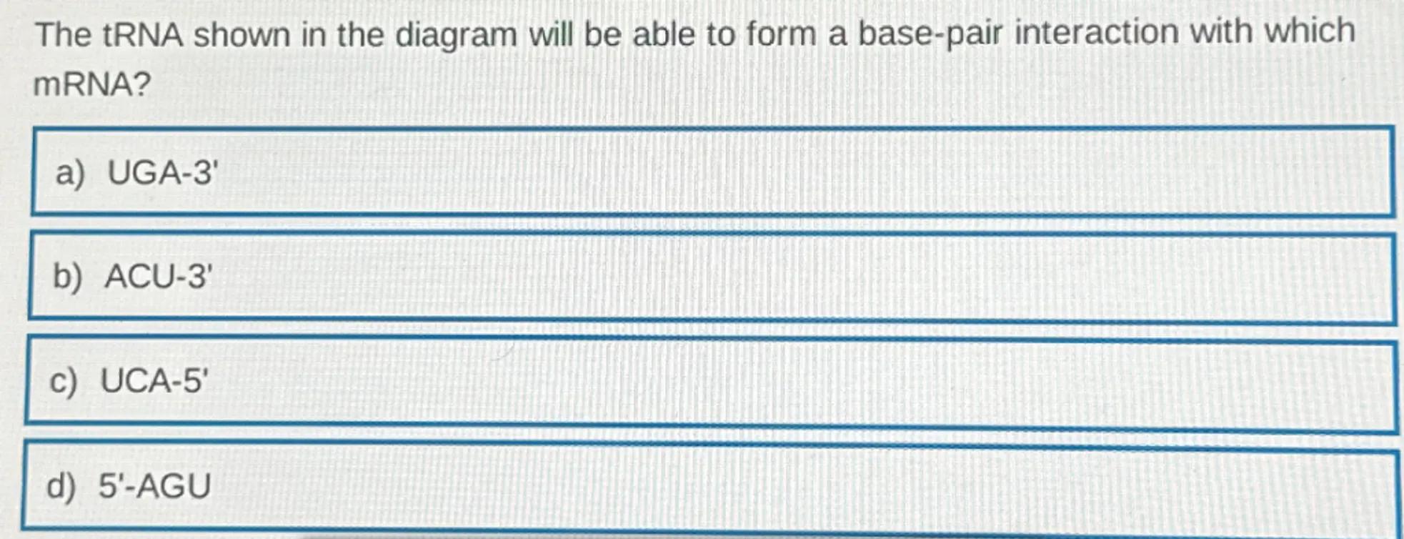 The tRNA shown in the diagram will be able to form a base-pair interaction with which mRNA?