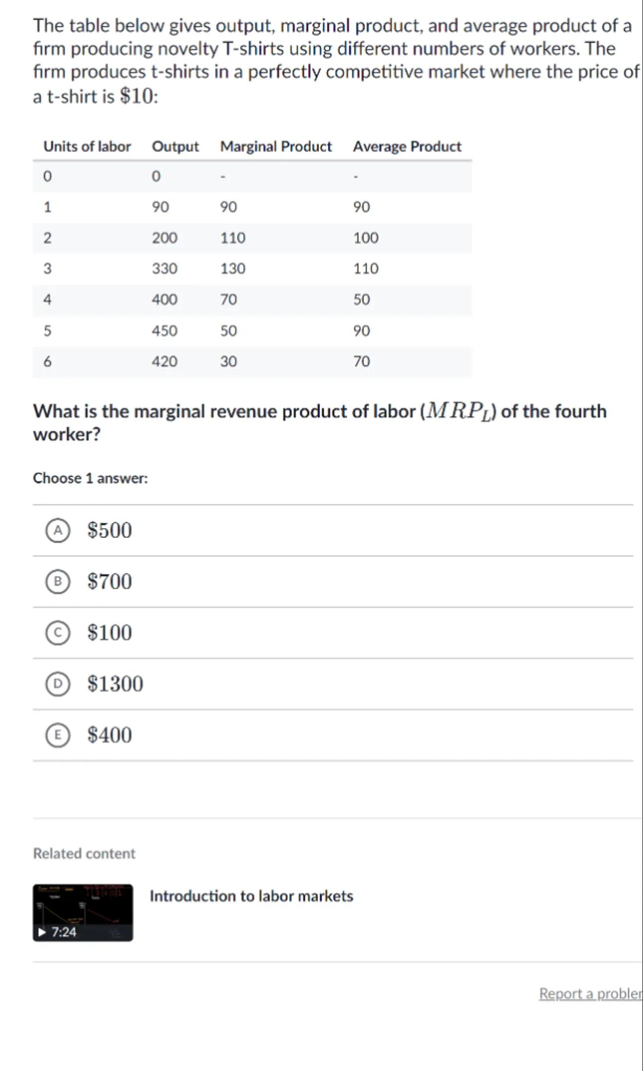 The table below gives output, marginal product, and average product of a firm producing novelty -shirts using different numbers of workers. The firm produces t-shirts in a perfectly competitive market where the price of a t-shirt is :