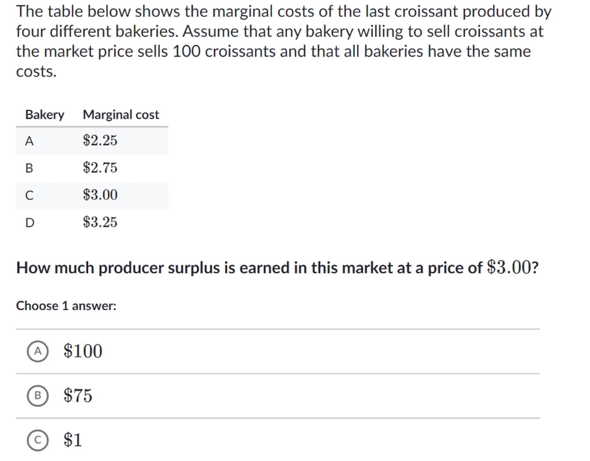 The table below shows the marginal costs of the last croissant produced by four different bakeries. Assume that any bakery willing to sell croissants at the market price sells 100 croissants and that all bakeries have the same costs.