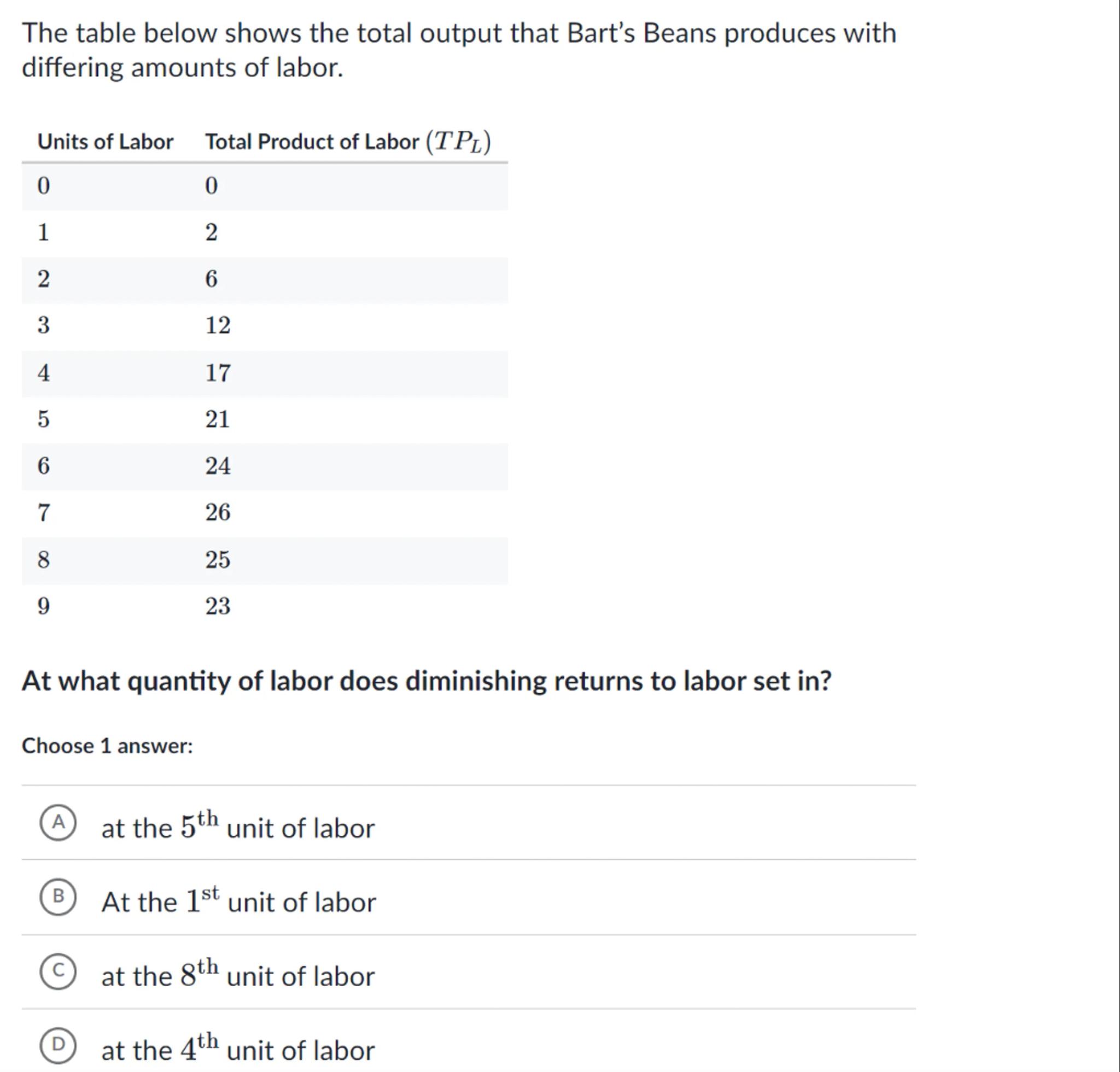 The table below shows the total output that Bart's Beans produces with differing amounts of labor.