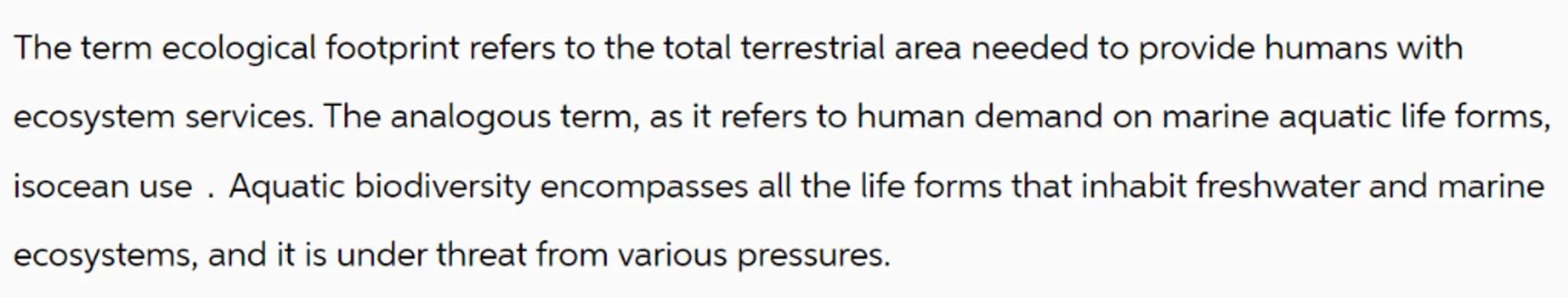The term ecological footprint refers to the total terrestrial area needed to provide humans with ecosystem services. The analogous term, as it refers to human demand on marine aquatic life forms, isocean use. Aquatic biodiversity encompasses all the life forms that inhabit freshwater and marine ecosystems, and it is under threat from various pressures.