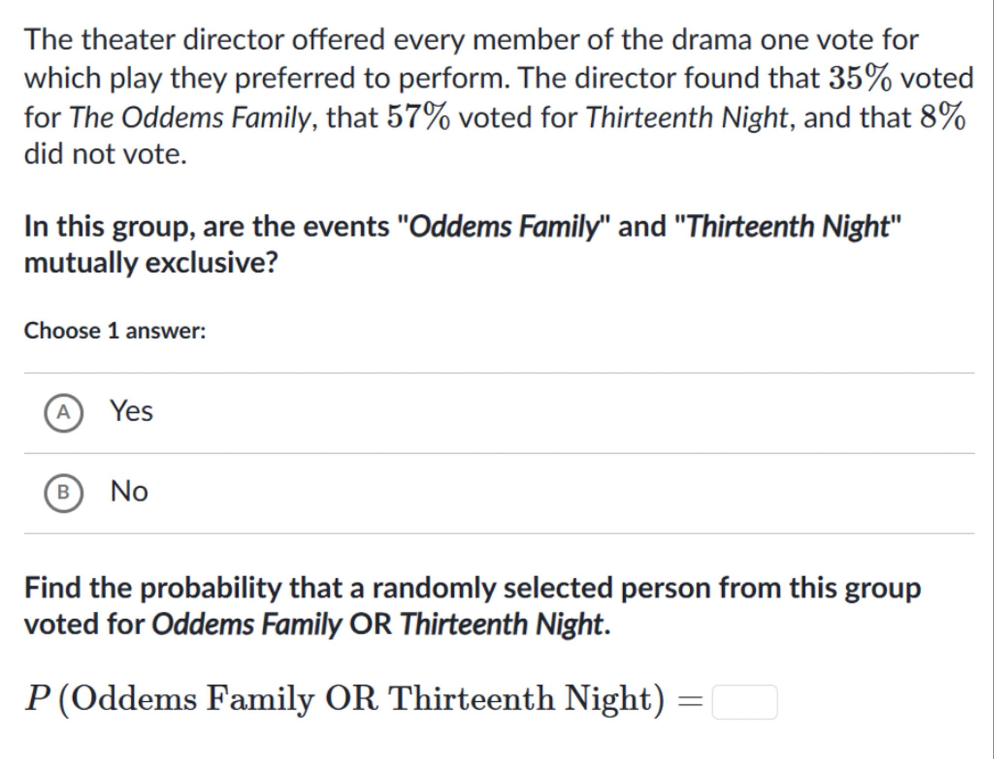 The theater director offered every member of the drama one vote for which play they preferred to perform. The director found that voted for The Oddems Family, that voted for Thirteenth Night, and that did not vote.
