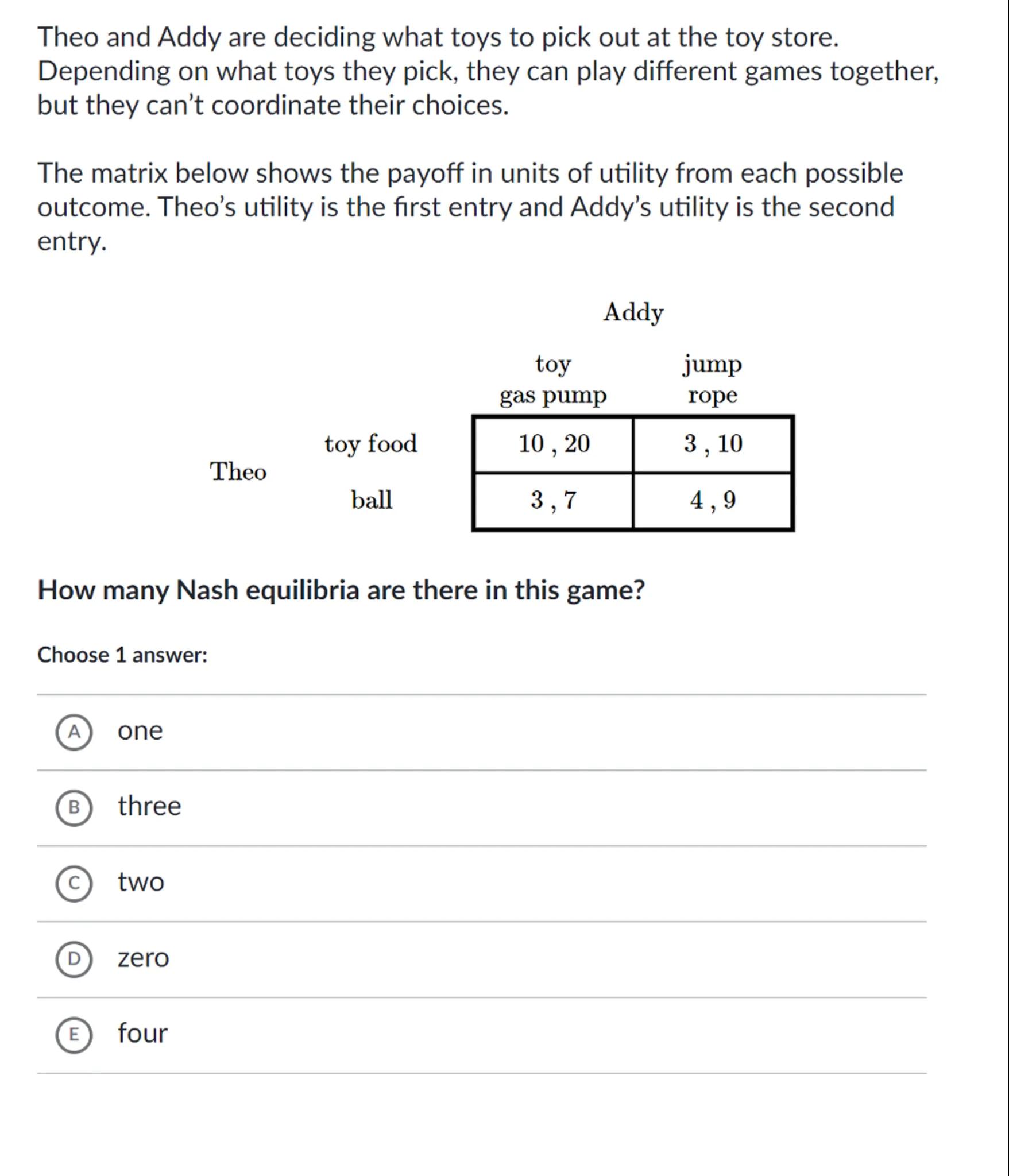 Theo and Addy are deciding what toys to pick out at the toy store. Depending on what toys they pick, they can play different games together, but they can't coordinate their choices.