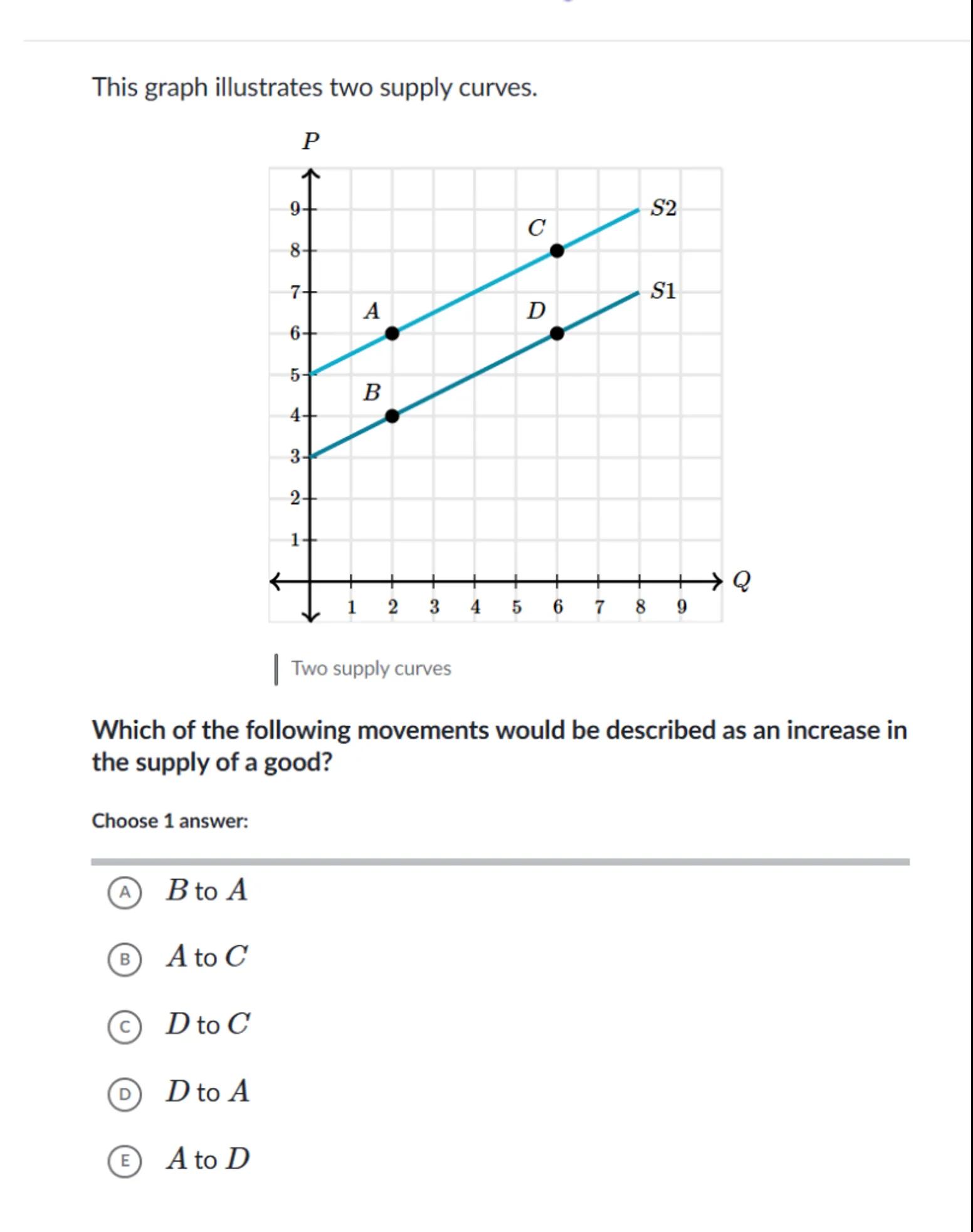Which of the following movements would be described as an increase in the supply of a good?