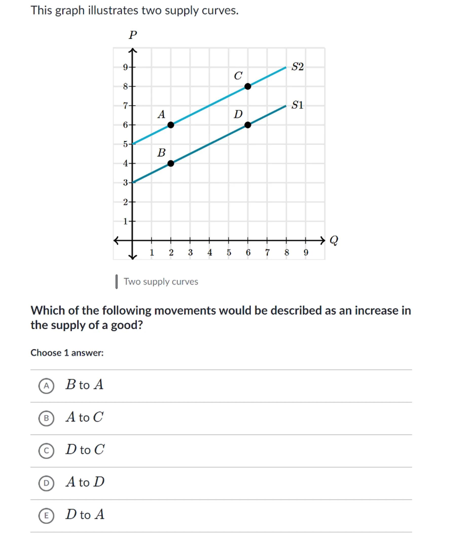 Which of the following movements would be described as an increase in the supply of a good?