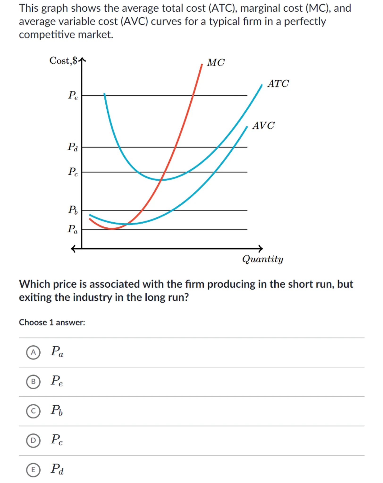 Which price is associated with the firm producing in the short run, but exiting the industry in the long run?