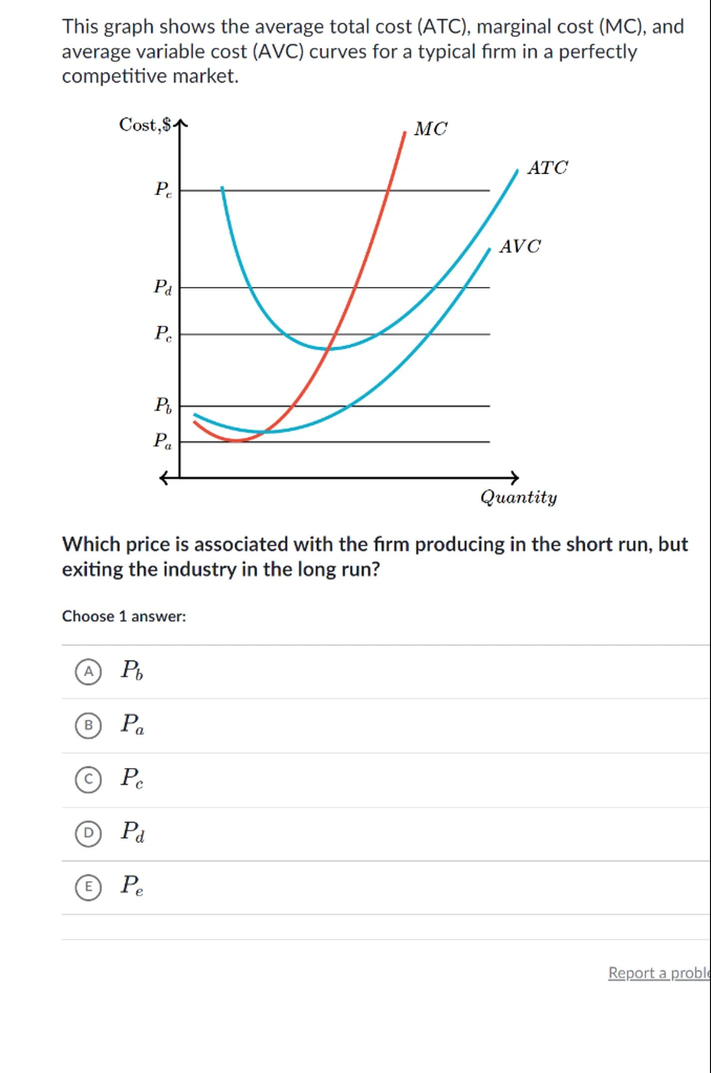 Which price is associated with the firm producing in the short run, but exiting the industry in the long run?