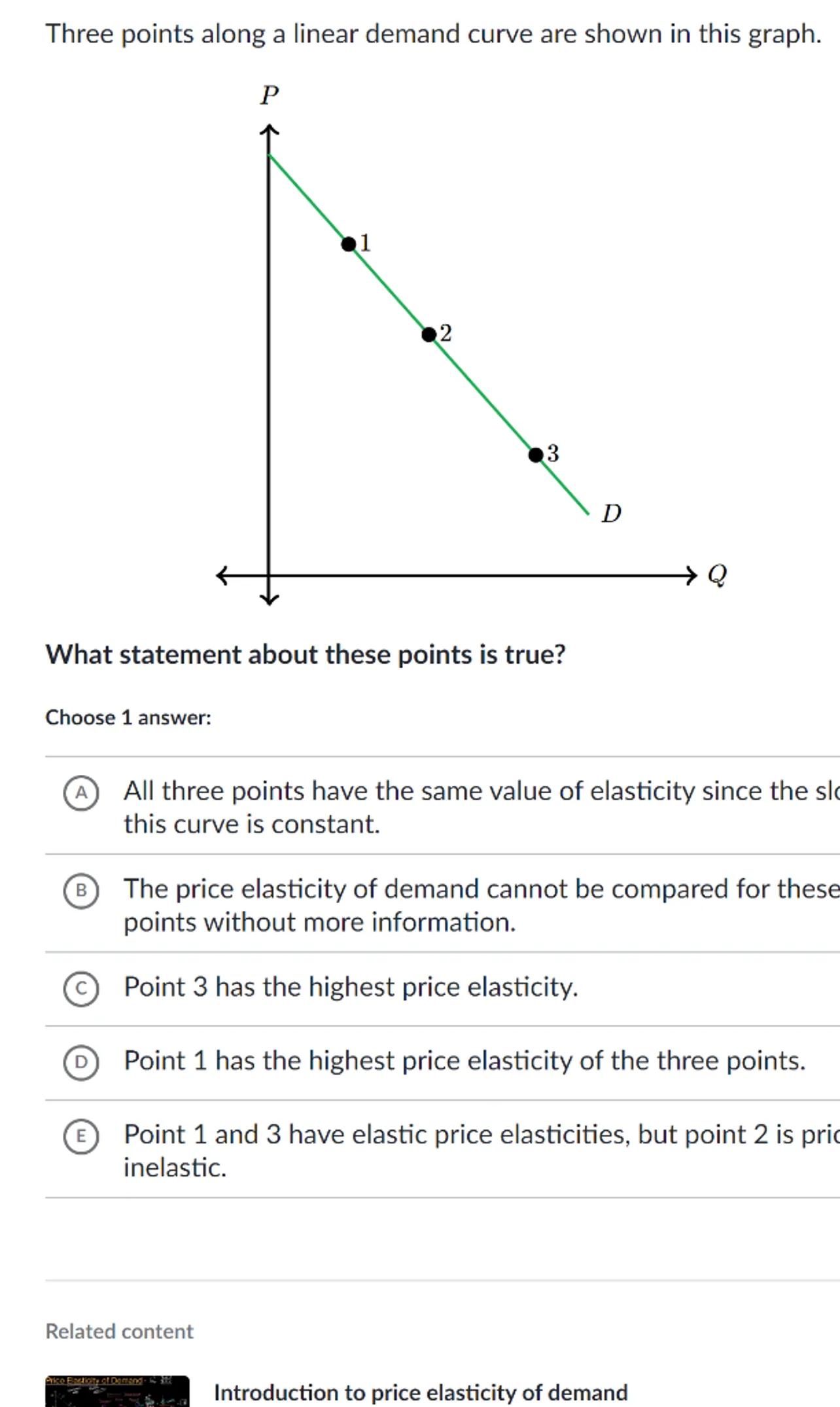 (A) All three points have the same value of elasticity since the this curve is constant.