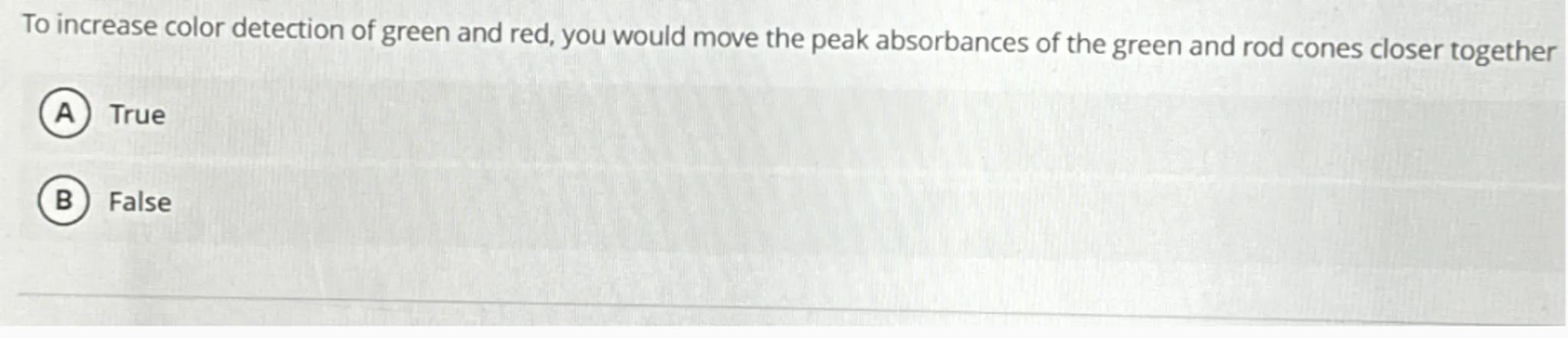 To increase color detection of green and red, you would move the peak absorbances of the green and rod cones closer together