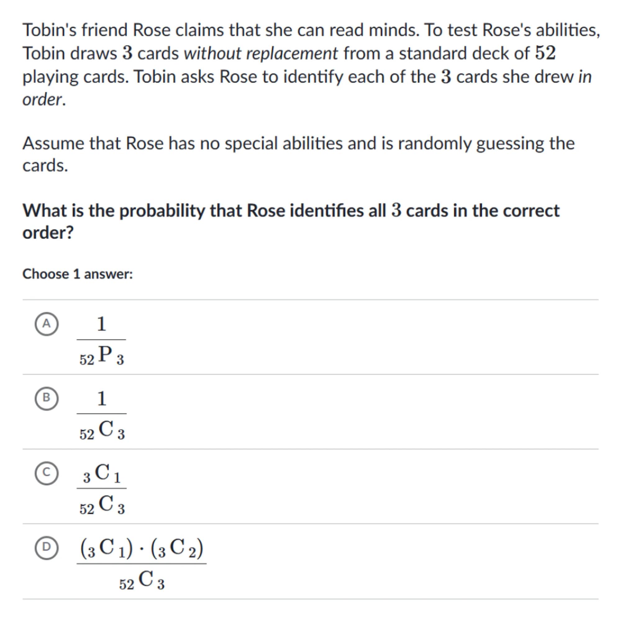 Tobin's friend Rose claims that she can read minds. To test Rose's abilities, Tobin draws 3 cards without replacement from a standard deck of 52 playing cards. Tobin asks Rose to identify each of the 3 cards she drew in order.