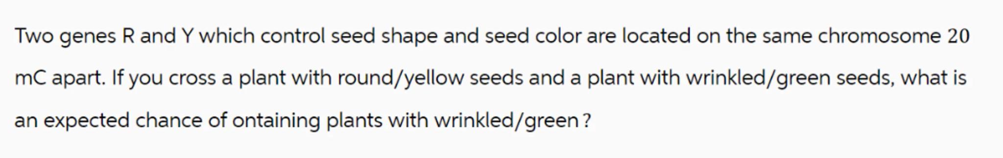 Two genes and which control seed shape and seed color are located on the same chromosome 20 apart. If you cross a plant with round/yellow seeds and a plant with wrinkled/green seeds, what is an expected chance of ontaining plants with wrinkled/green?
