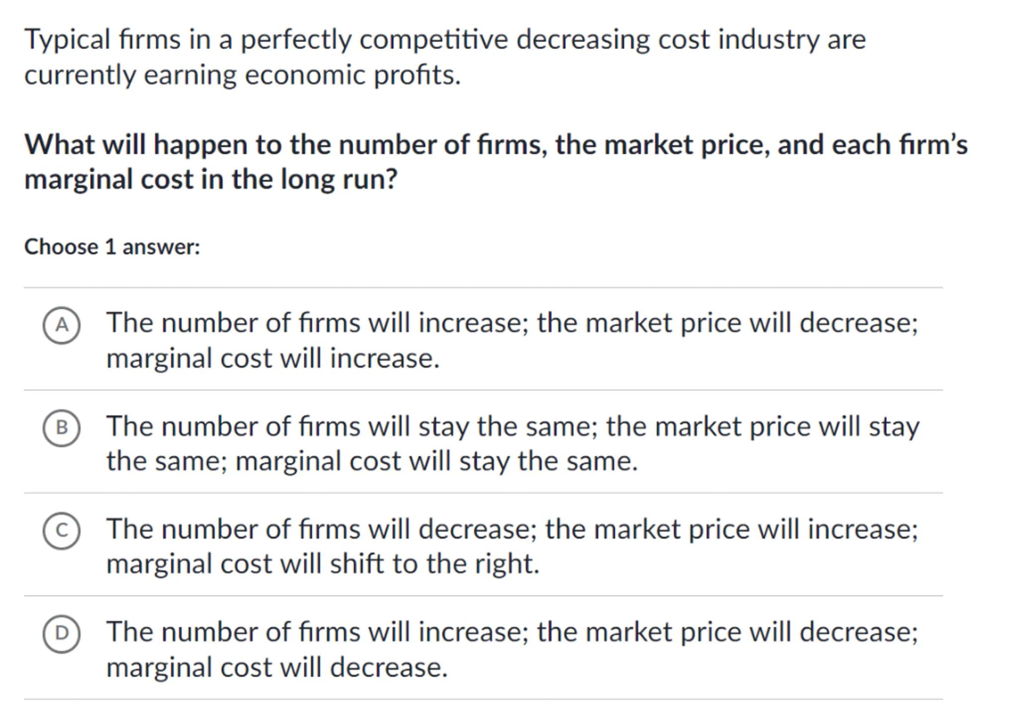 (D) The number of firms will increase; the market price will decrease; marginal cost will decrease.