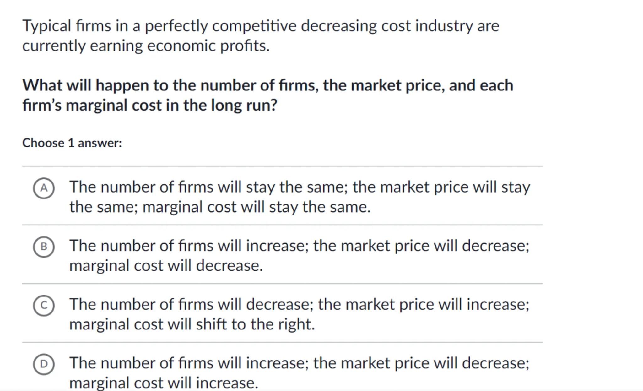 (B) The number of firms will increase; the market price will decrease; marginal cost will decrease.