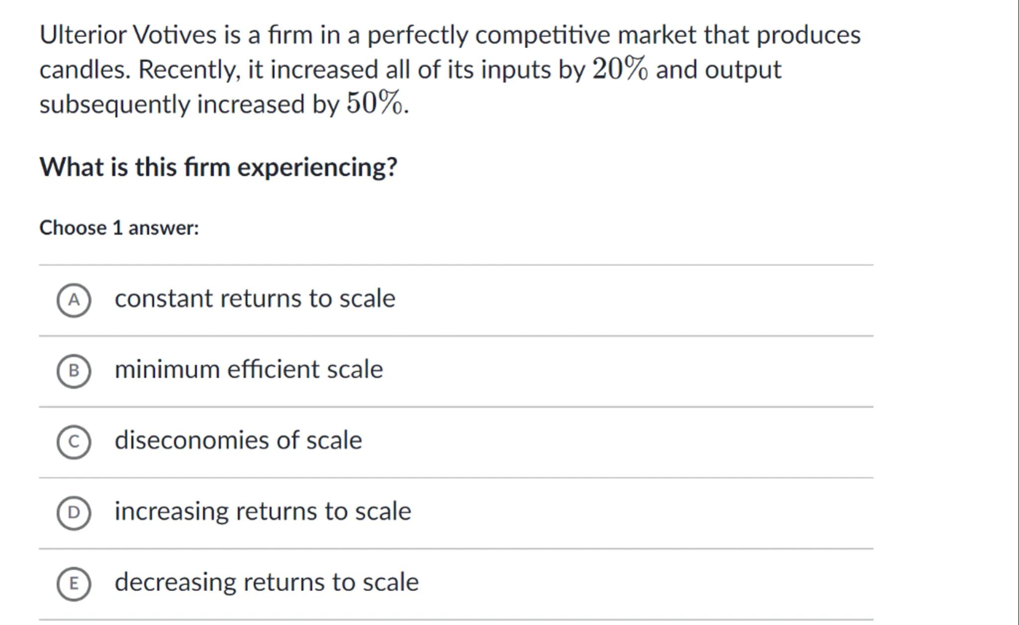 Ulterior Votives is a firm in a perfectly competitive market that produces candles. Recently, it increased all of its inputs by and output subsequently increased by .