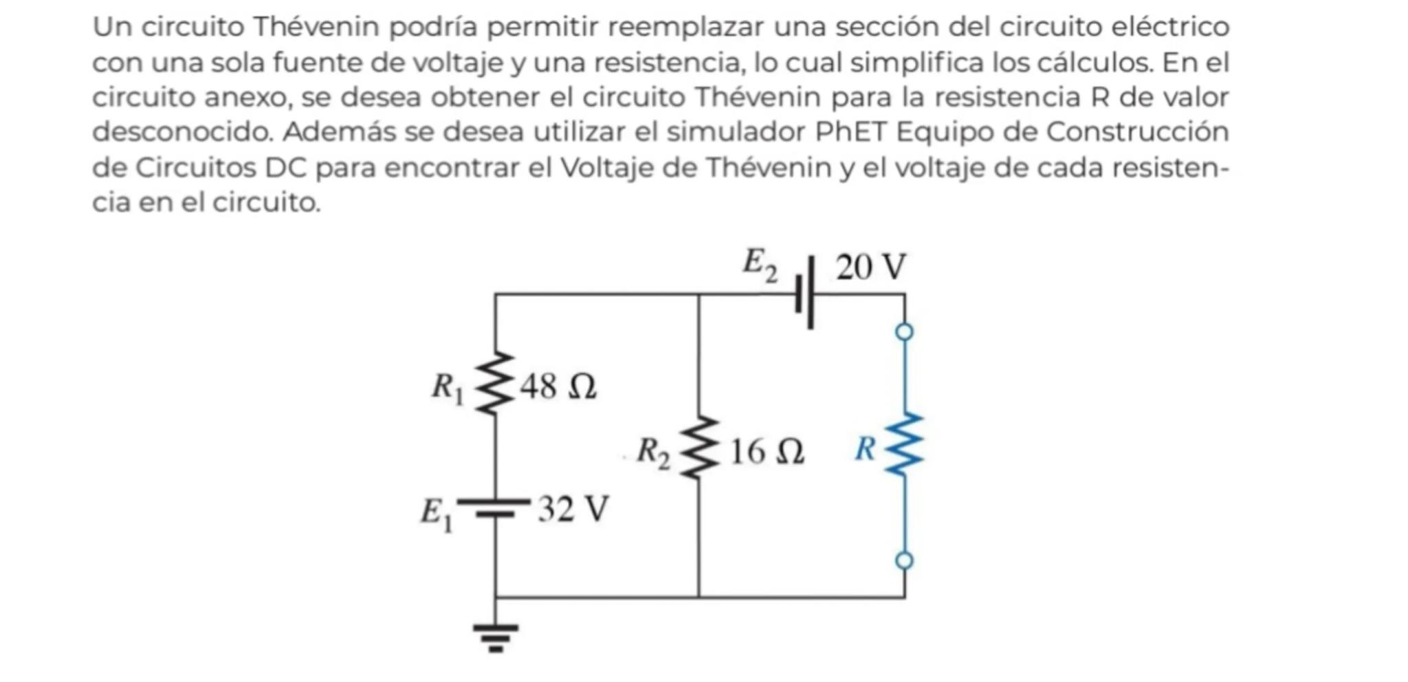 Un circuito Thévenin podría permitir reemplazar una sección del circuito eléctrico con una sola fuente de voltaje y una resistencia, lo cual simplifica los cálculos. En el circuito anexo, se desea obtener el circuito Thévenin para la resistencia R de valor desconocido. Además se desea utilizar el simulador PhET Equipo de Construcción de Circuitos DC para encontrar el Voltaje de Thévenin y el voltaje de cada resistencia en el circuito.