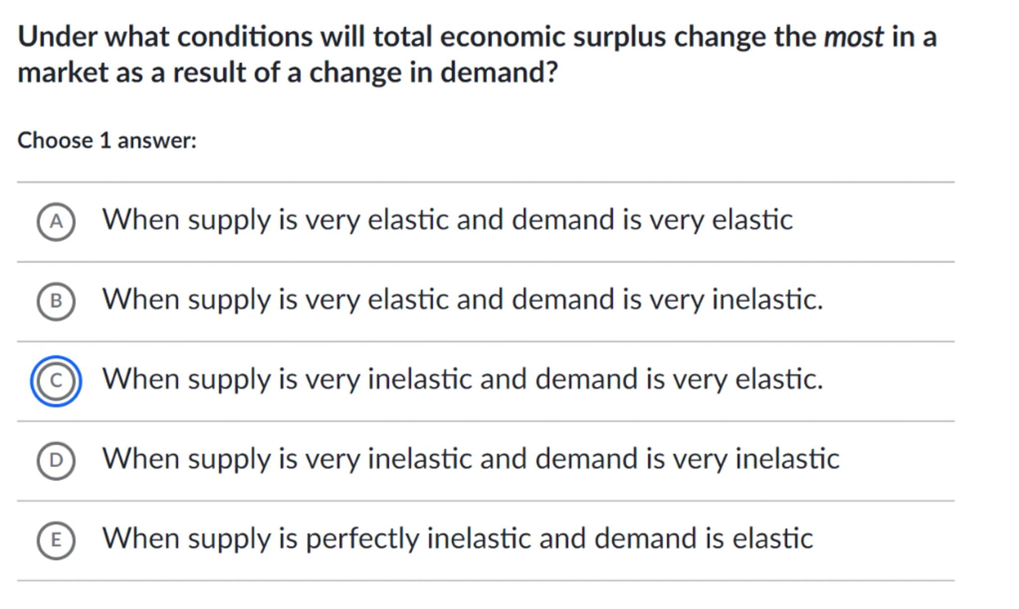 Under what conditions will total economic surplus change the most in a market as a result of a change in demand?