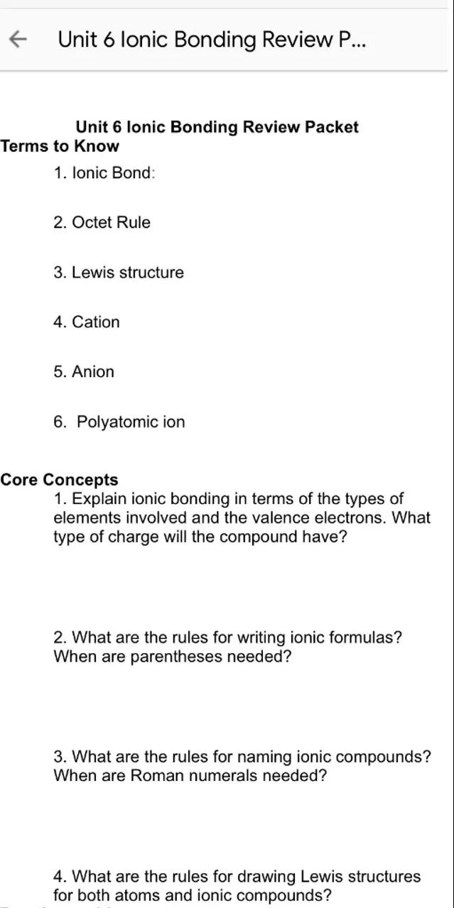 Unit 6 Ionic Bonding Review Packet Terms to Know