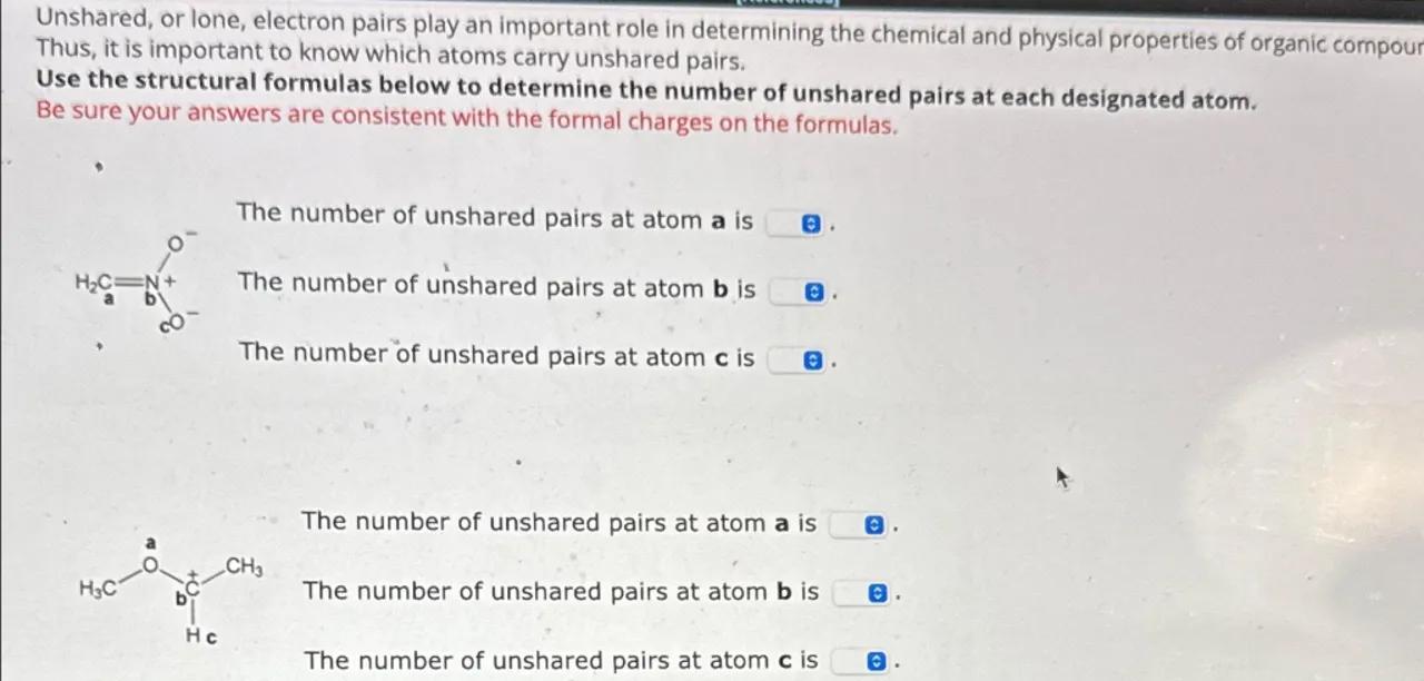 Unshared, or lone, electron pairs play an important role in determining the chemical and physical properties of organic compour Thus, it is important to know which atoms carry unshared pairs.