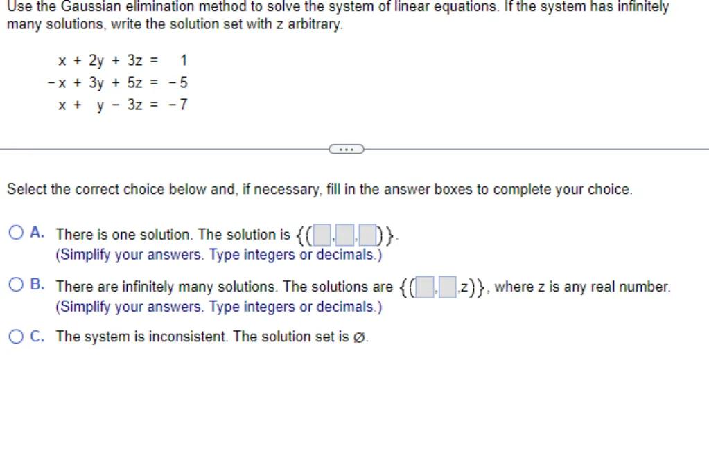 Use the Gaussian elimination method to solve the system of linear equations. If the system has infinitely many solutions, write the solution set with z arbitrary.