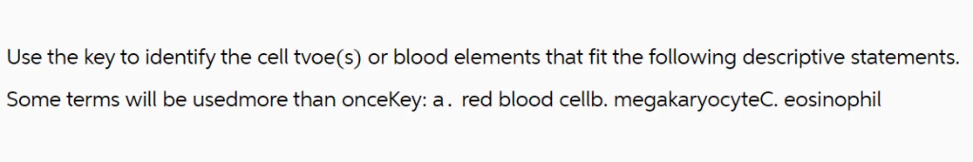 Use the key to identify the cell tvoe(s) or blood elements that fit the following descriptive statements. Some terms will be usedmore than onceKey: a. red blood cellb. megakaryocyteC. eosinophil