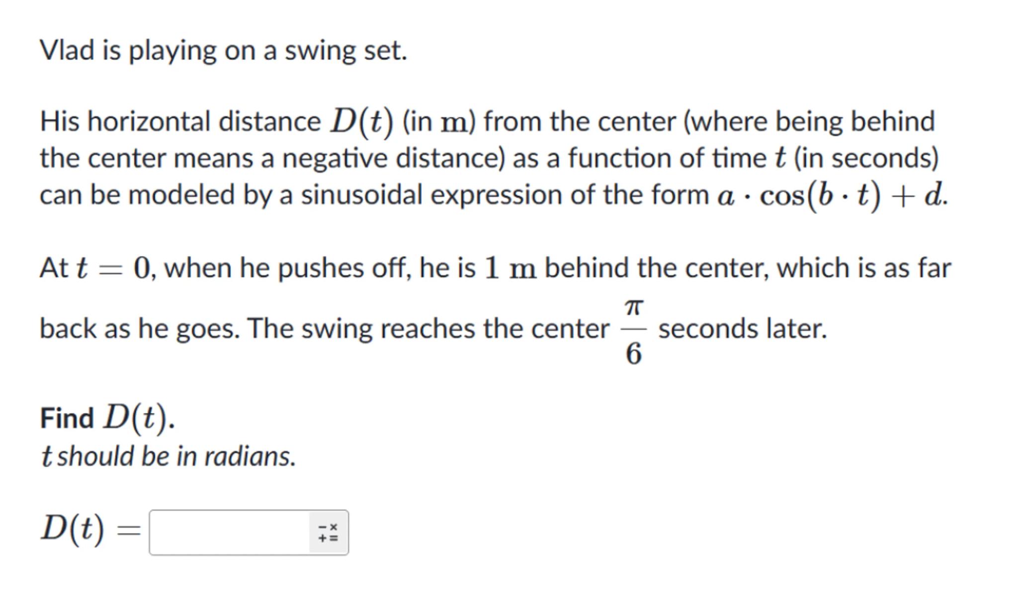 His horizontal distance  (in  ) from the center (where being behind the center means a negative distance) as a function of time  (in seconds) can be modeled by a sinusoidal expression of the form .