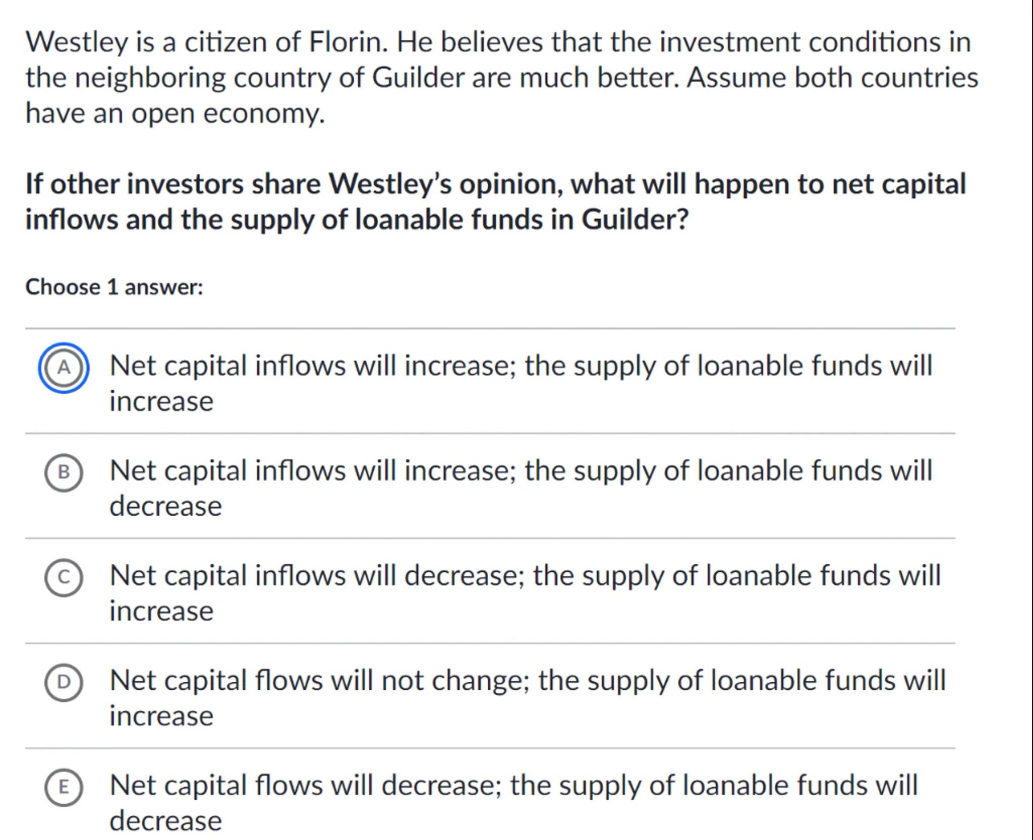 Westley is a citizen of Florin. He believes that the investment conditions in the neighboring country of Guilder are much better. Assume both countries have an open economy.