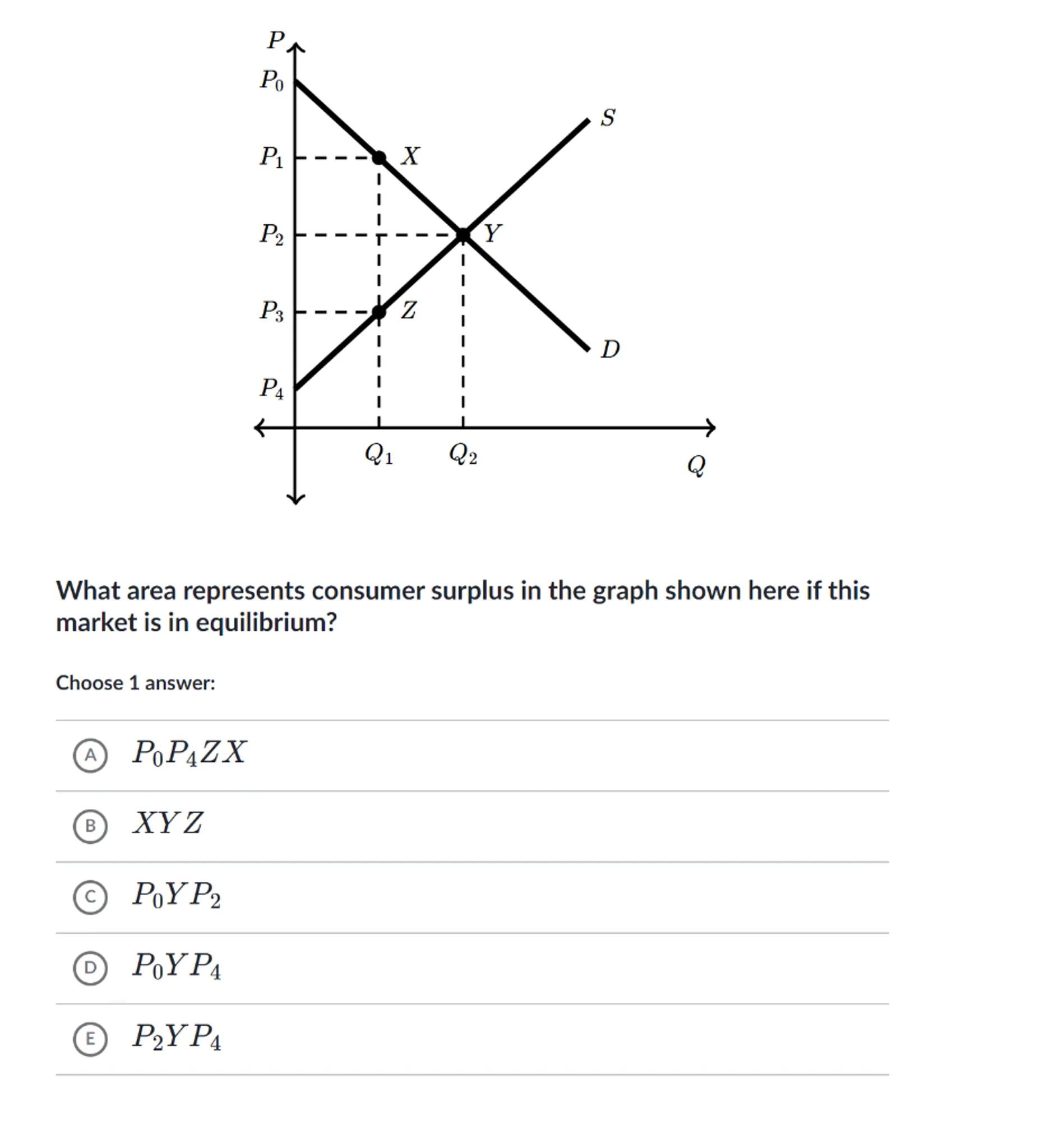 What area represents consumer surplus in the graph shown here if this market is in equilibrium?