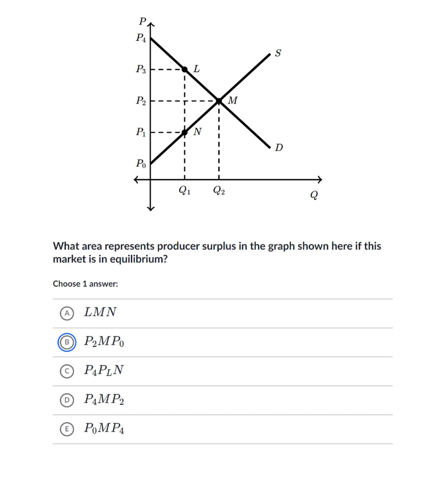 What area represents producer surplus in the graph shown here if this market is in equilibrium?
