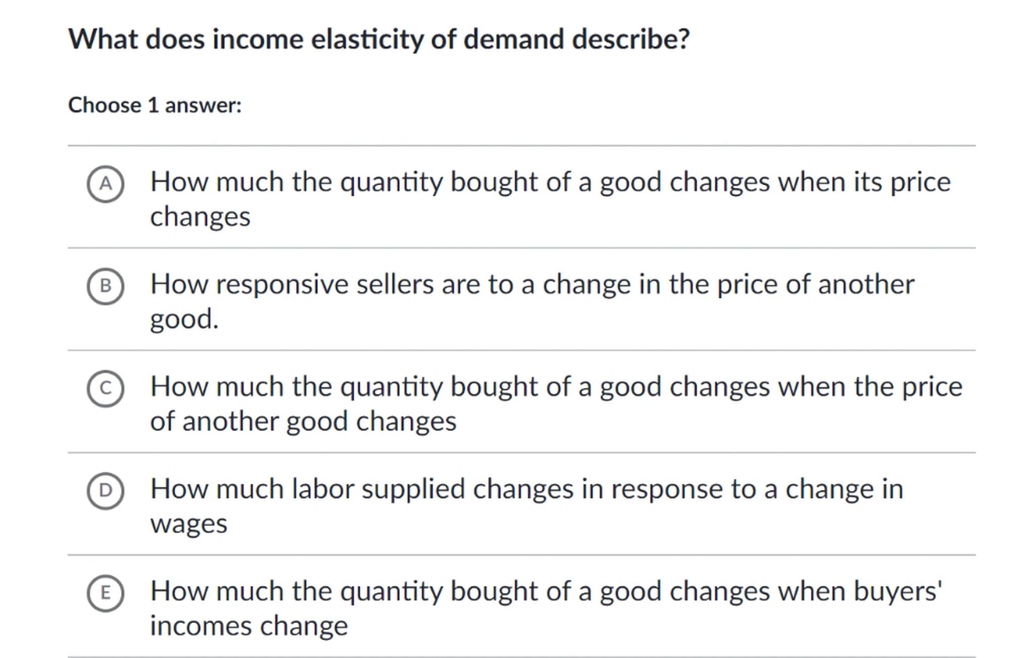 (E) How much the quantity bought of a good changes when buyers' incomes change